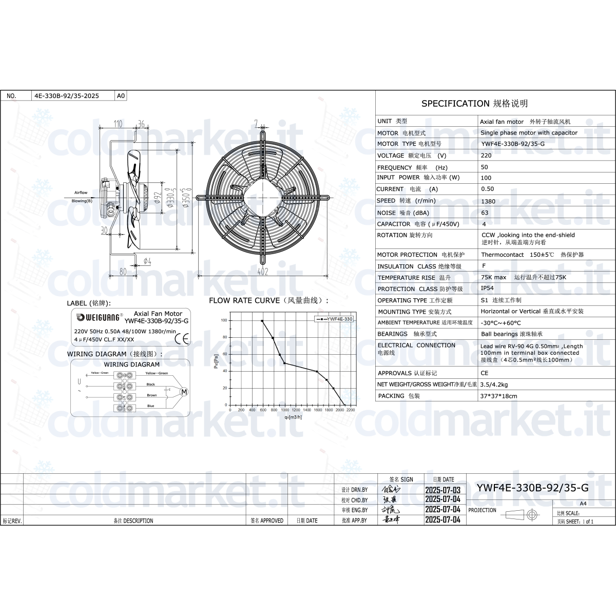 Ventilateur Axial Ø 330 mm Pression 220V 1400 tours/min Weiguang YWF4E-330B-92/35-G