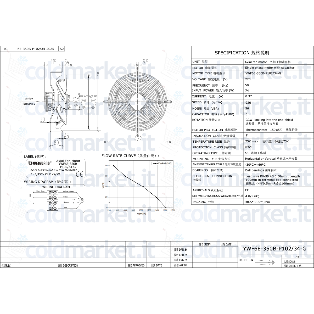 Ventilateur axial poulie Ø 350 mm Weiguang série YWF6E, alimentation 220V, vitesse 920 tours/min, condensateur intégré, degré de protection IP54 et faible bruit, idéal pour les systèmes de réfrigération et de climatisation où un flux d'air constant et silencieux est requis.