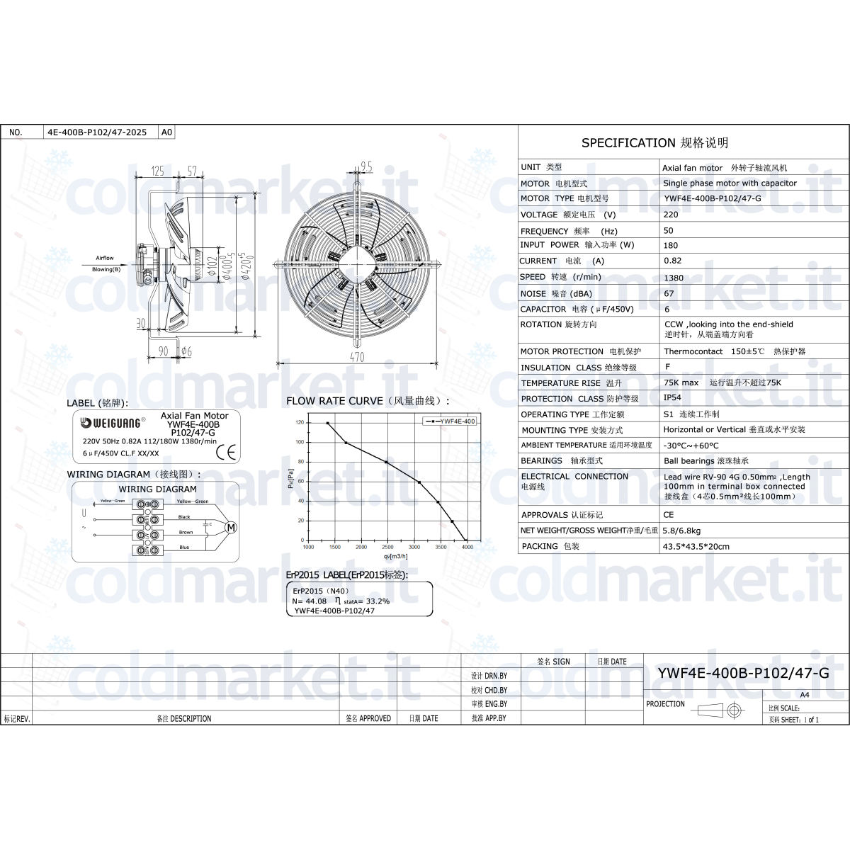Ventilateur Axial Ø 400 mm Prémente 220V 1400 tours/min Weiguang YWF4E-400B-P102/47-G