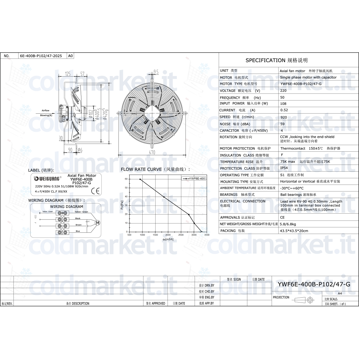 Ventilateur axial poussant Ø 400 mm Weiguang série YWF6E, alimentation 220V, vitesse 900 tours/min, condensateur intégré, degré de protection IP54 et faible bruit, idéal pour les systèmes de réfrigération et de climatisation où une poussée d'air continue, uniforme et silencieuse est requise.