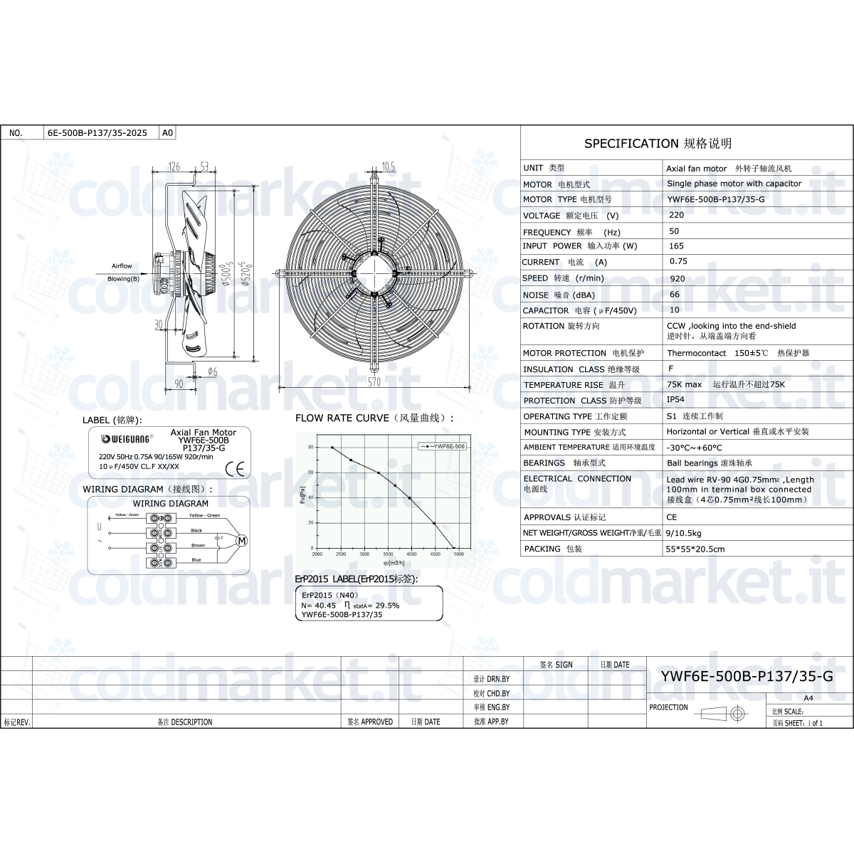 Ventilateur axial poussant Ø 500 mm Weiguang série YWF6E, alimentation 220V, vitesse 920 tours/min, condensateur intégré, degré de protection IP54 et faible bruit, idéal pour les systèmes de réfrigération et de climatisation où une poussée d'air élevée, continue et silencieuse est requise.