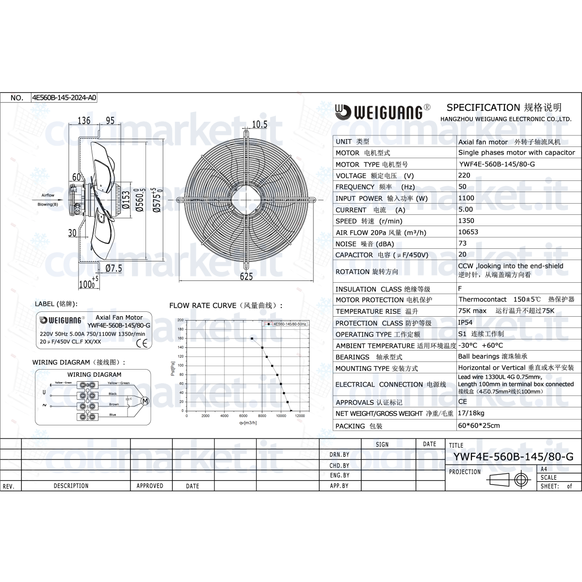 Ventilateur Axial Ø 560 mm Pression Monophasé 230V 1350 tr/min Weiguang YWF4E-560B-145L80