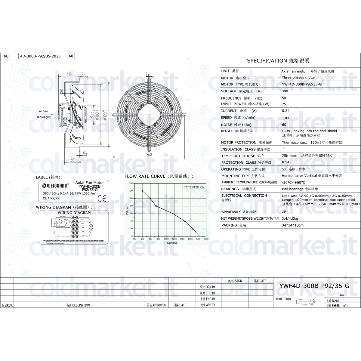 Ventilateur axial poussant Ø 300 mm Weiguang, alimentation triphasée 380V, vitesse 1380 tours/min, degré de protection IP54 et débit d'air maximal ≈ 1900 m³/h, idéal pour installations de réfrigération, climatisation et ventilation professionnelles et industrielles.