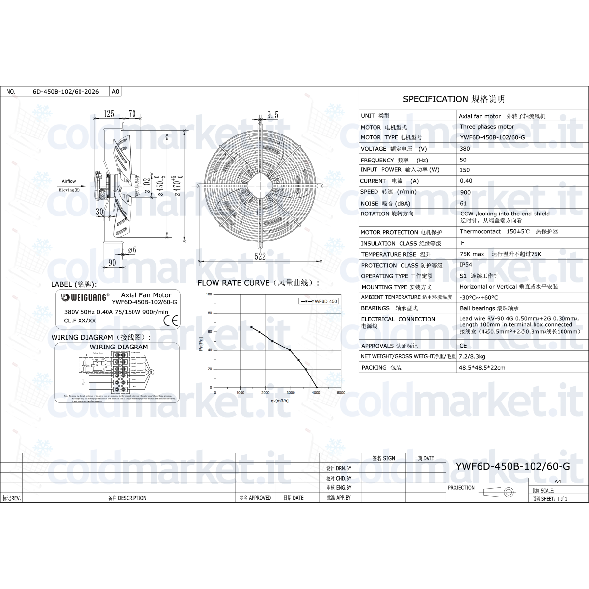 Ventilateur axial poussant Ø 450 mm Weiguang, alimentation triphasée 380V, vitesse 900 tours/min, degré de protection IP54 et fonctionnement fiable pour réfrigération, climatisation et ventilation professionnelle. Poussée d’air stable pour applications sur condenseurs et batteries d'échange thermique, avec moteur triphasé conçu pour service continu.