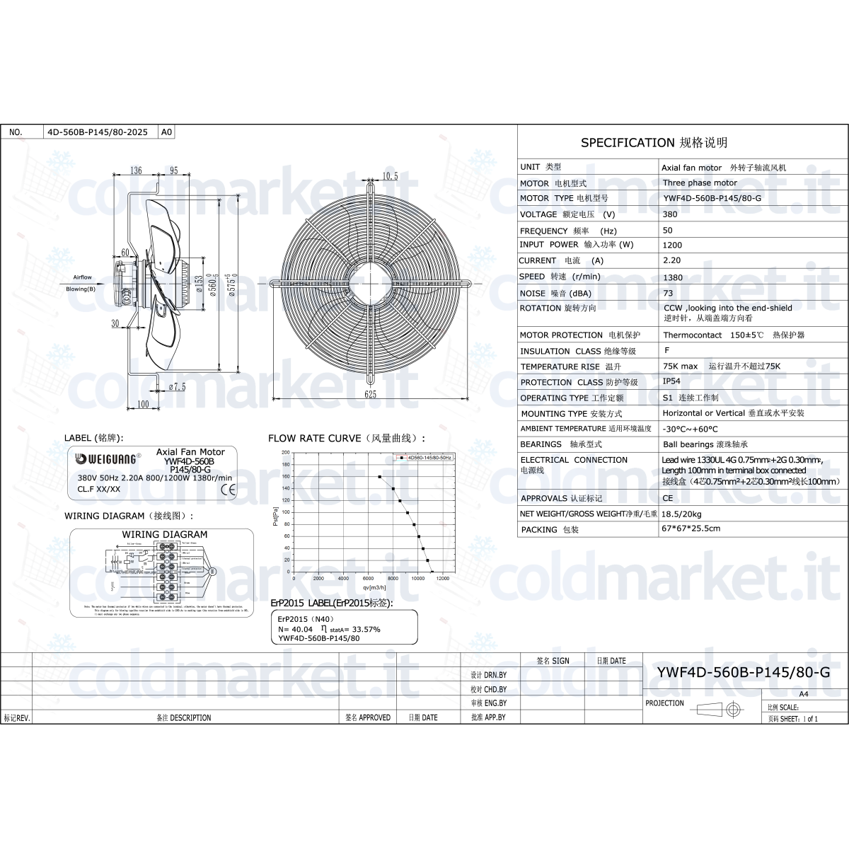 Ventilateur axial poussant Ø 560 mm Weiguang, alimentation triphasée 380V, vitesse 1380 tours/min, degré de protection IP54 et débit d'air maximum ≈ 11.500 m³/h, idéal pour systèmes de réfrigération, climatisation et ventilation industrielle à très haute puissance.