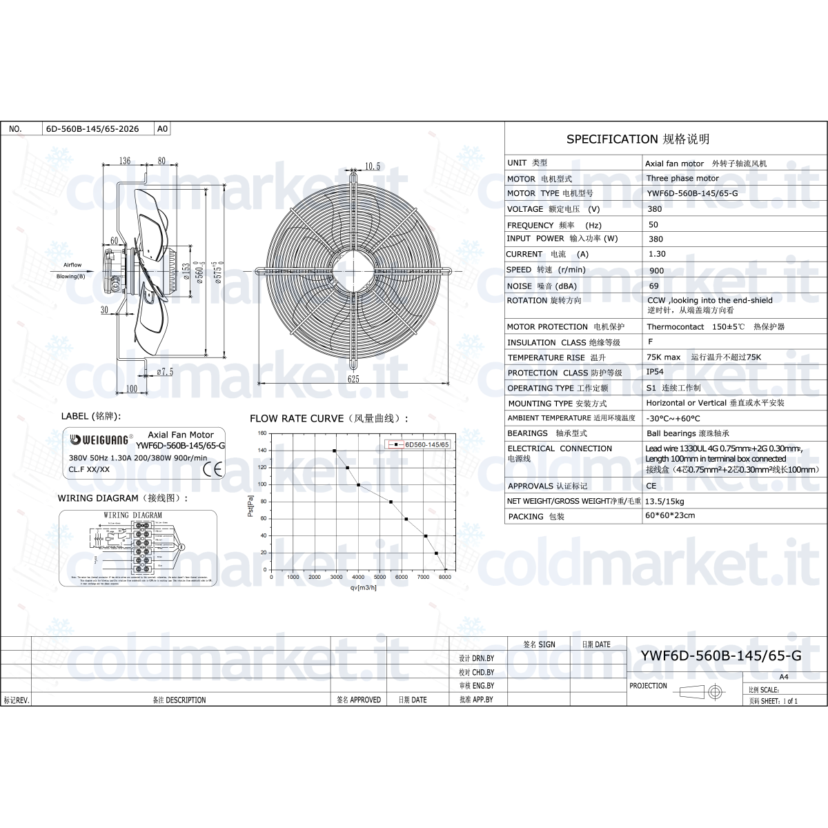 Ventilateur axial presseur Ø 560 mm Weiguang, alimentation triphase 380V, vitesse 900 tours/min, degré de protection IP54 et débit d'air élevé, idéal pour condensateurs, unités condensantes, CVC et réfrigération industrielle.