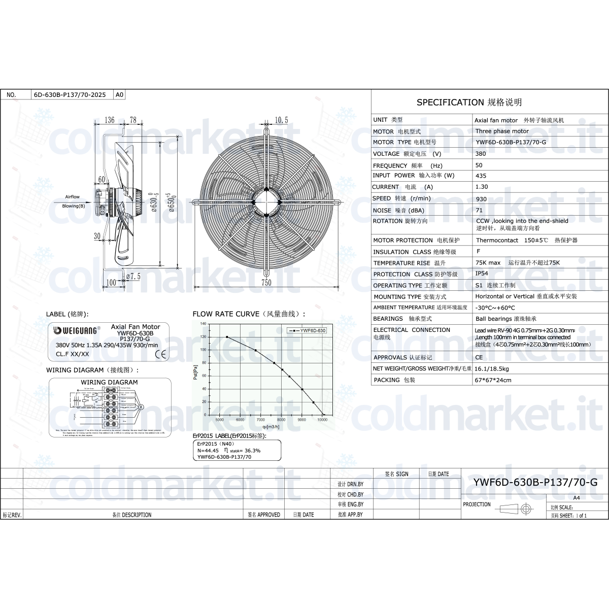 Ventilateur axial poussant Ø 630 mm Weiguang, alimentation triphasée 380V, vitesse 930 tours/min, degré de protection IP54 et débit d'air très élevé, idéal pour installations de réfrigération, climatisation et ventilation industrielle.