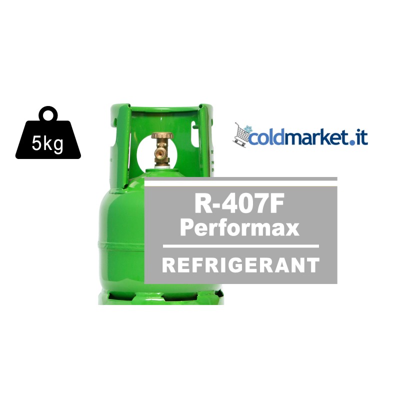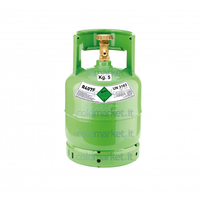 Il gas refrigerante R407F in bombola da 5 kg è un refrigerante professionale utilizzato per la manutenzione, assistenza e riparazione di impianti di refrigerazione e climatizzazione già installati, progettati per funzionare con R407F.
