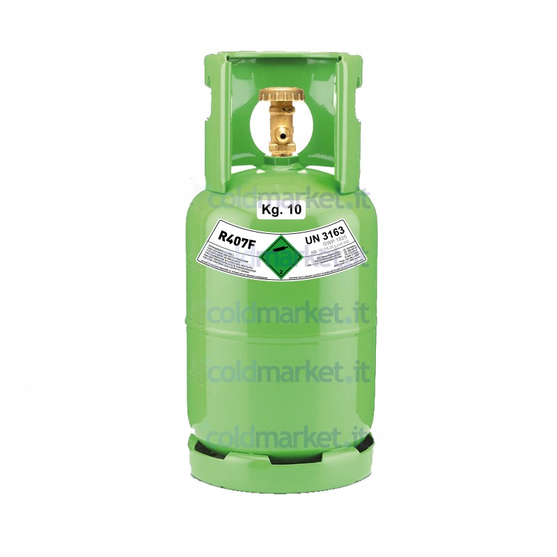 Le gaz réfrigérant R407F en bouteille de 10 kg est un réfrigérant professionnel utilisé pour la maintenance, l'assistance et la réparation des installations de réfrigération et de climatisation déjà installées, conçues pour fonctionner avec le R407F.
