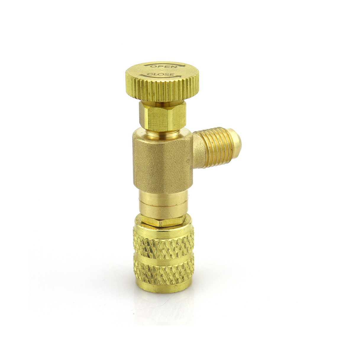 Robinet de prévalve ST-VC1 d'interception avec connexions F-1/4″ SAE × M-1/4″ SAE, idéal pour contrôler et interrompre le flux de réfrigérant lors des opérations de charge HVAC/R.