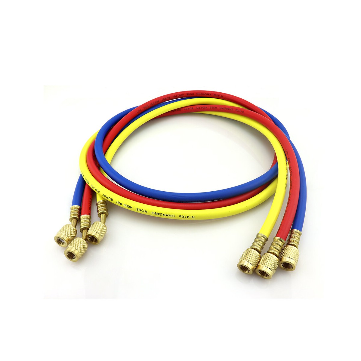 L'emballage comprend 3 tuyaux de recharge professionnels, chacun avec une longueur de 150 cm et une connexion standard 1/4″ SAE, compatible avec les manomètres, les robinets à soupape et les outils de service utilisés dans le secteur de la climatisation et de la réfrigération.