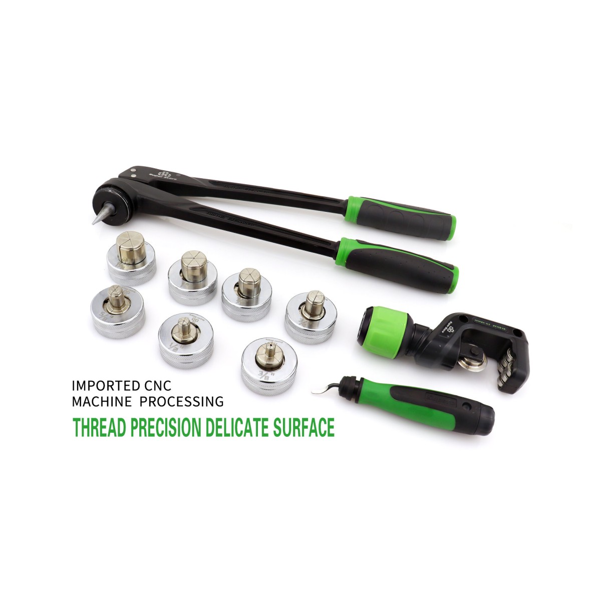 Le corps en alliage d'aluminium garantit robustesse et légèreté, tandis que les têtes d'expansion interchangeables permettent de s'adapter à différentes tailles de tuyaux en millimètres. La poignée ergonomique antidérapante assure confort et sécurité même lors d'utilisations prolongées.
