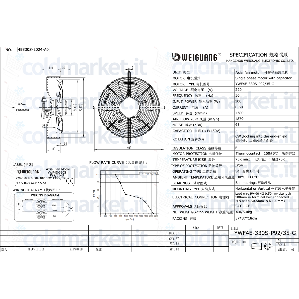 Ventilateur Axial Ø 330 mm Aspirant 220V 1400 tr/min Weiguang YWF4E-330S-P92L35-G