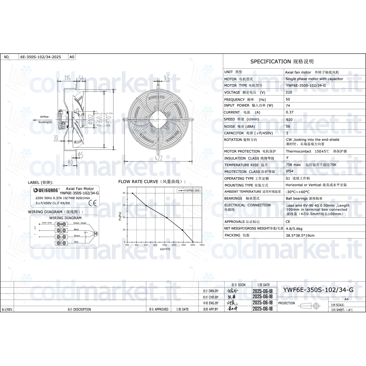 Ventilateur axial aspirant Ø 350 mm Weiguang série YWF6E, alimentation 220V, vitesse 900 tours/min, condensateur intégré, degré de protection IP54 et faible bruit, idéal pour les systèmes de réfrigération et de climatisation où une ventilation continue et silencieuse est requise.