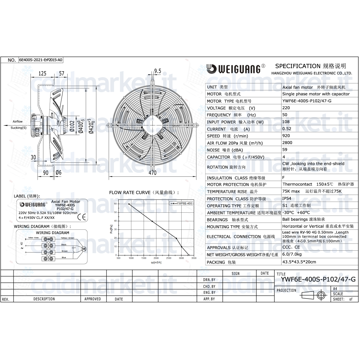Ventilateur axial aspirant Ø 400 mm Weiguang série YWF6E, alimentation 220V, vitesse 900 tours/min, condensateur intégré, degré de protection IP54 et faible bruit, idéal pour les systèmes de réfrigération et de climatisation où un flux d'air continu, stable et silencieux est requis.