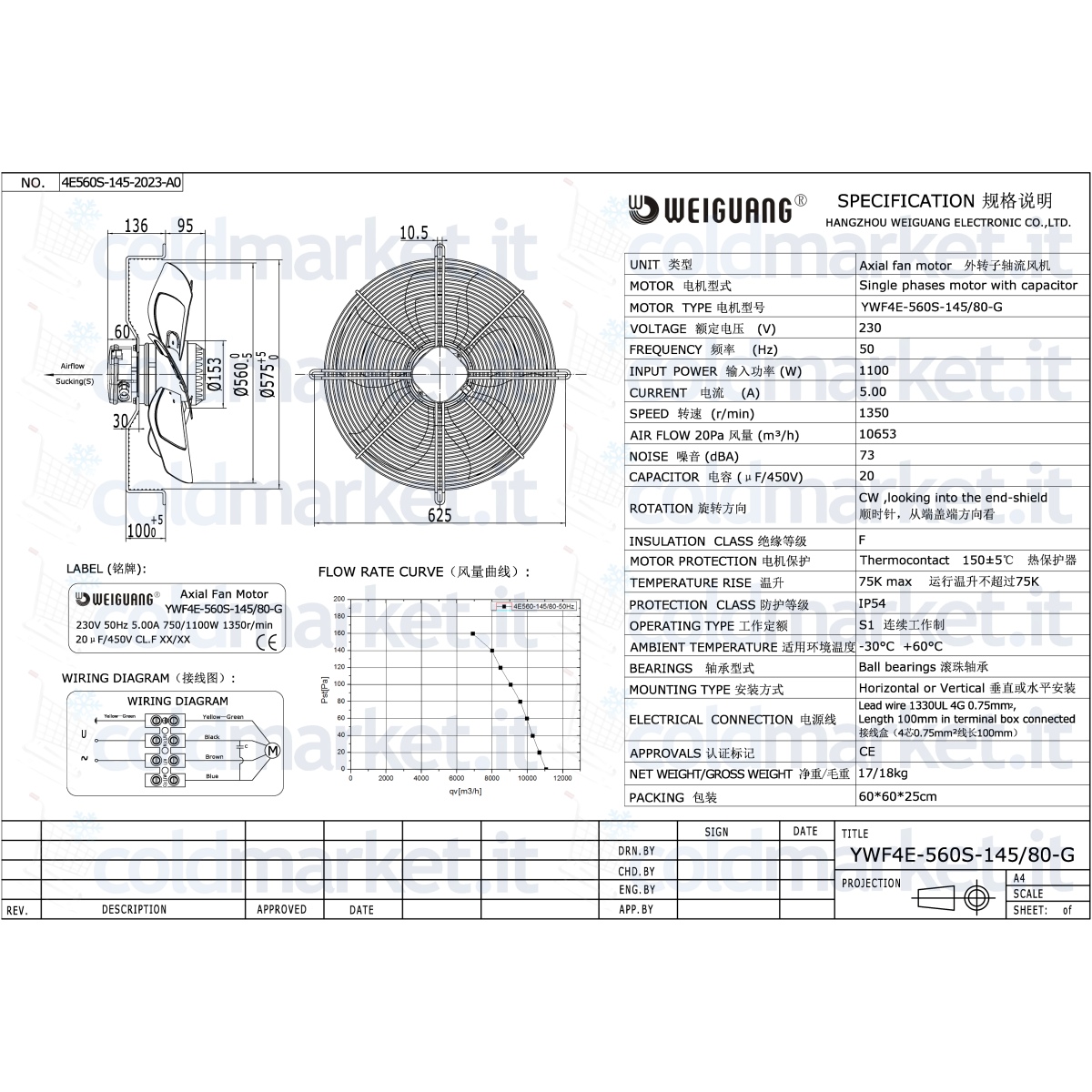 Ventilateur axial aspirant Ø 560 mm Weiguang, alimentation monophasée 230V, vitesse 1350 tours/min, degré de protection IP54 et débit d'air élevé, idéal pour systèmes HVAC, réfrigération commerciale et ventilation professionnelle.