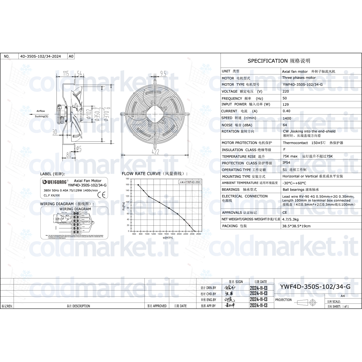 Ventilateur axial aspirant Ø 350 mm Weiguang, alimentation triphasée 380V, vitesse 1400 tours/min, degré de protection IP54 et débit d'air maximum ≈ 4000 m³/h, idéal pour systèmes de réfrigération, climatisation et ventilation professionnels et industriels.
