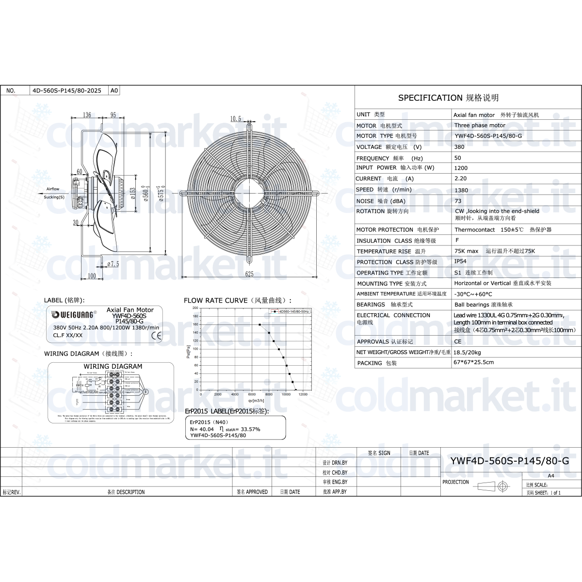 Ventilateur axial aspirant Ø 560 mm Weiguang, alimentation triphasée 380V, vitesse 1380 tours/min, degré de protection IP54 et débit d'air maximum ≈ 11.000 m³/h, idéal pour les systèmes de réfrigération, de climatisation et de ventilation industrielle à très haute puissance.