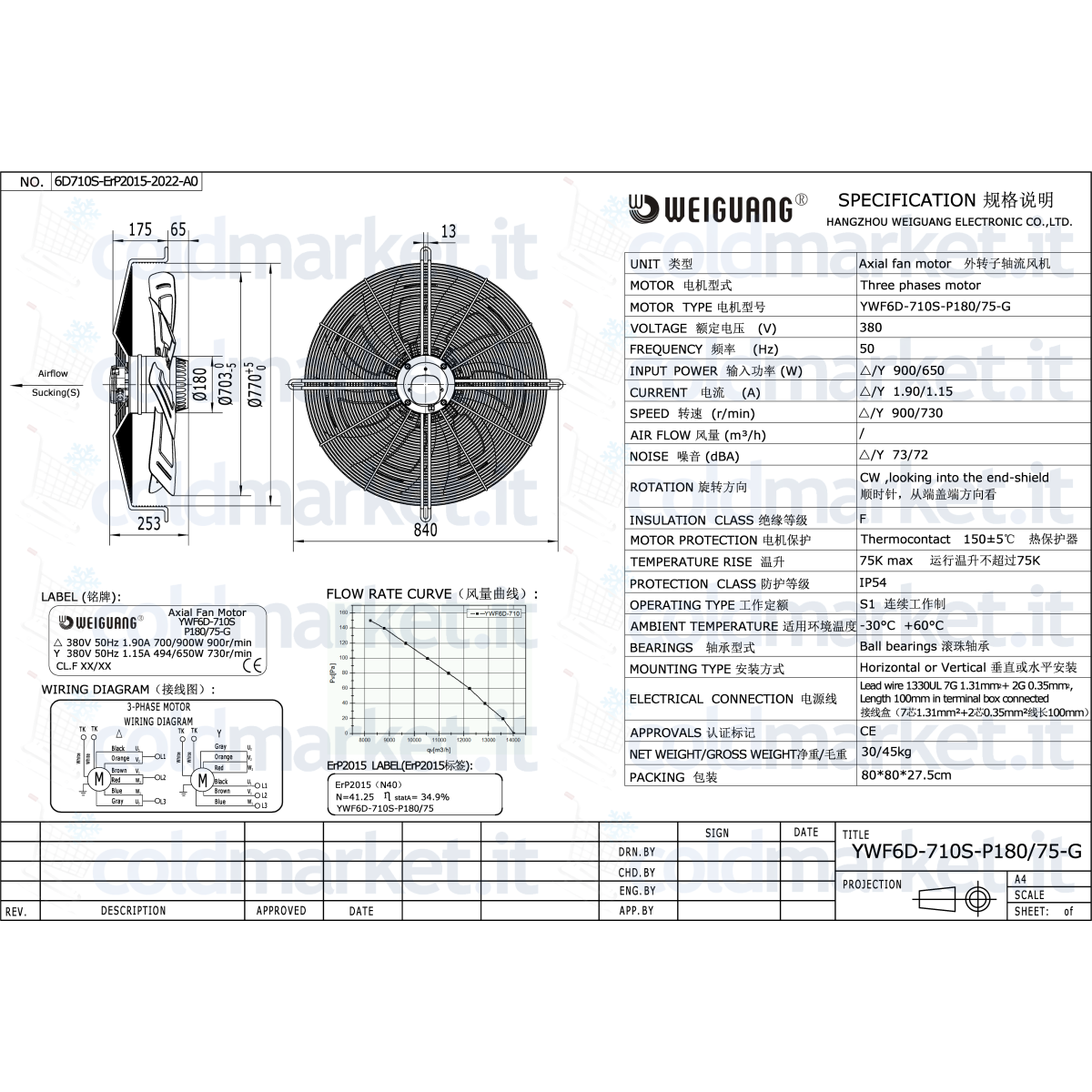 Ventilateur axial aspirant Ø 710 mm Weiguang, alimentation triphasée 380V, vitesse 730 tours/min, degré de protection IP54 et débit d'air très élevé, idéal pour installations HVAC industrielles, réfrigération de grande capacité et systèmes de ventilation à haut volume d'air.