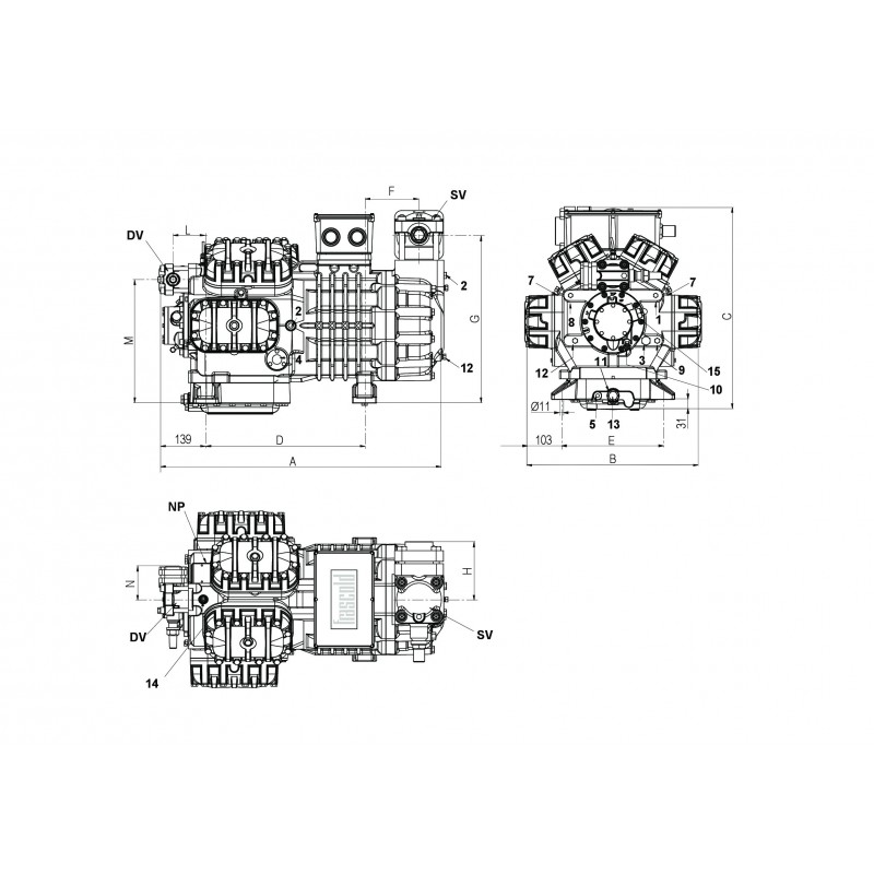compresseur 8 cylindres avec moteur électrique intégré démarrage fractionné (PWS) et sondes-ptc connectées au système de protection et de diagnostic