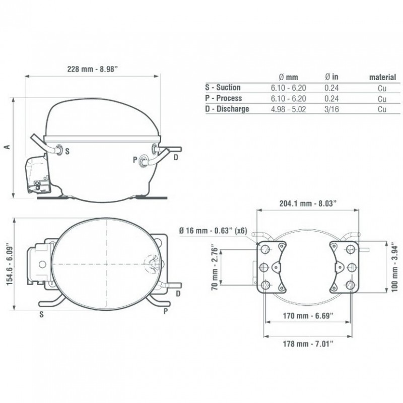 Compresseur gaz R404A R507 hermétique - 1/4 Hp - 4,5 cm3 - Embraco Aspera EMT6152GK