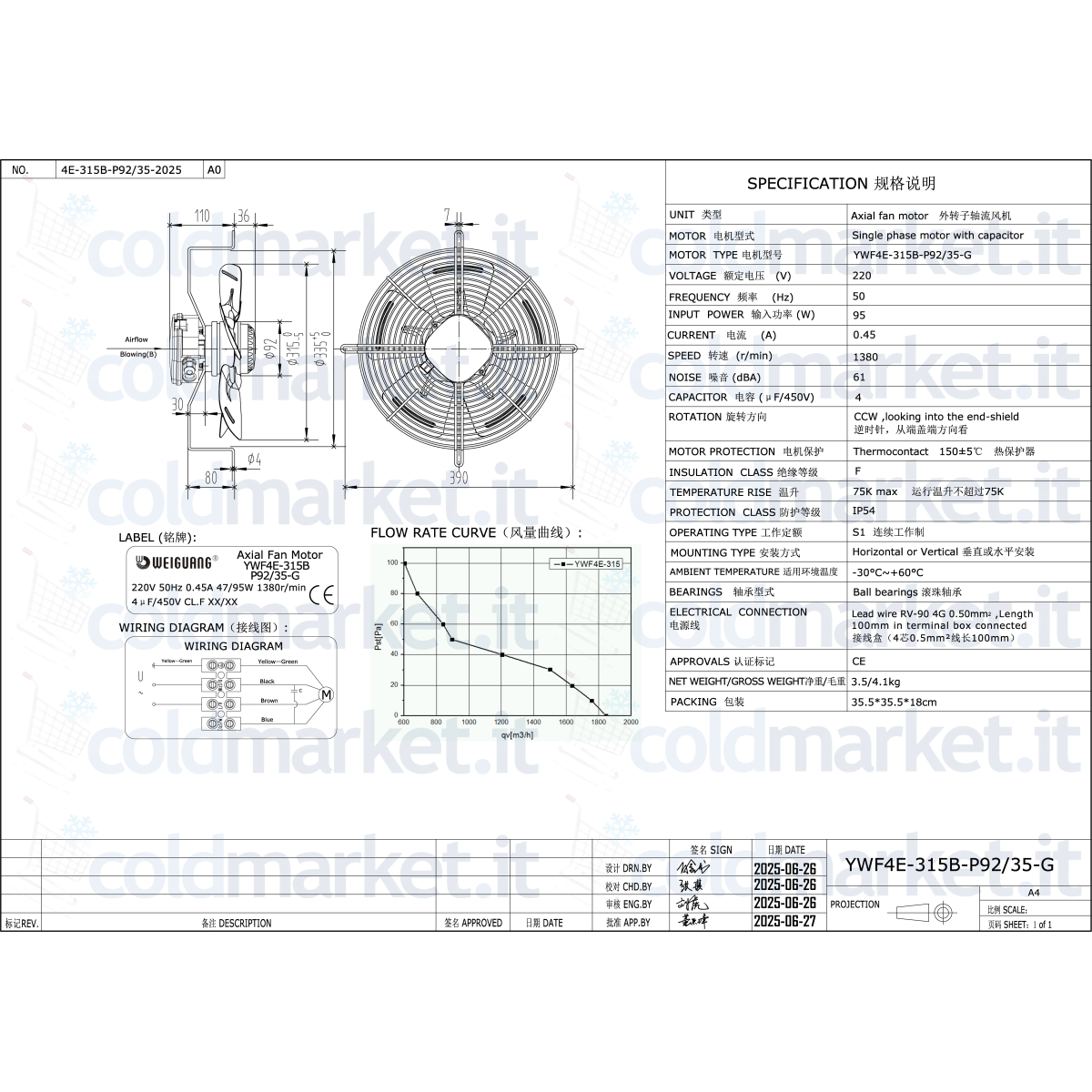 Ventilatore assiale premente Ø 315 mm Weiguang, alimentazione 220V, velocità 1400 giri/min, con condensatore integrato, grado di protezione IP54 e portata aria massima elevata, ideale per impianti di refrigerazione, climatizzazione e ventilazione professionale.