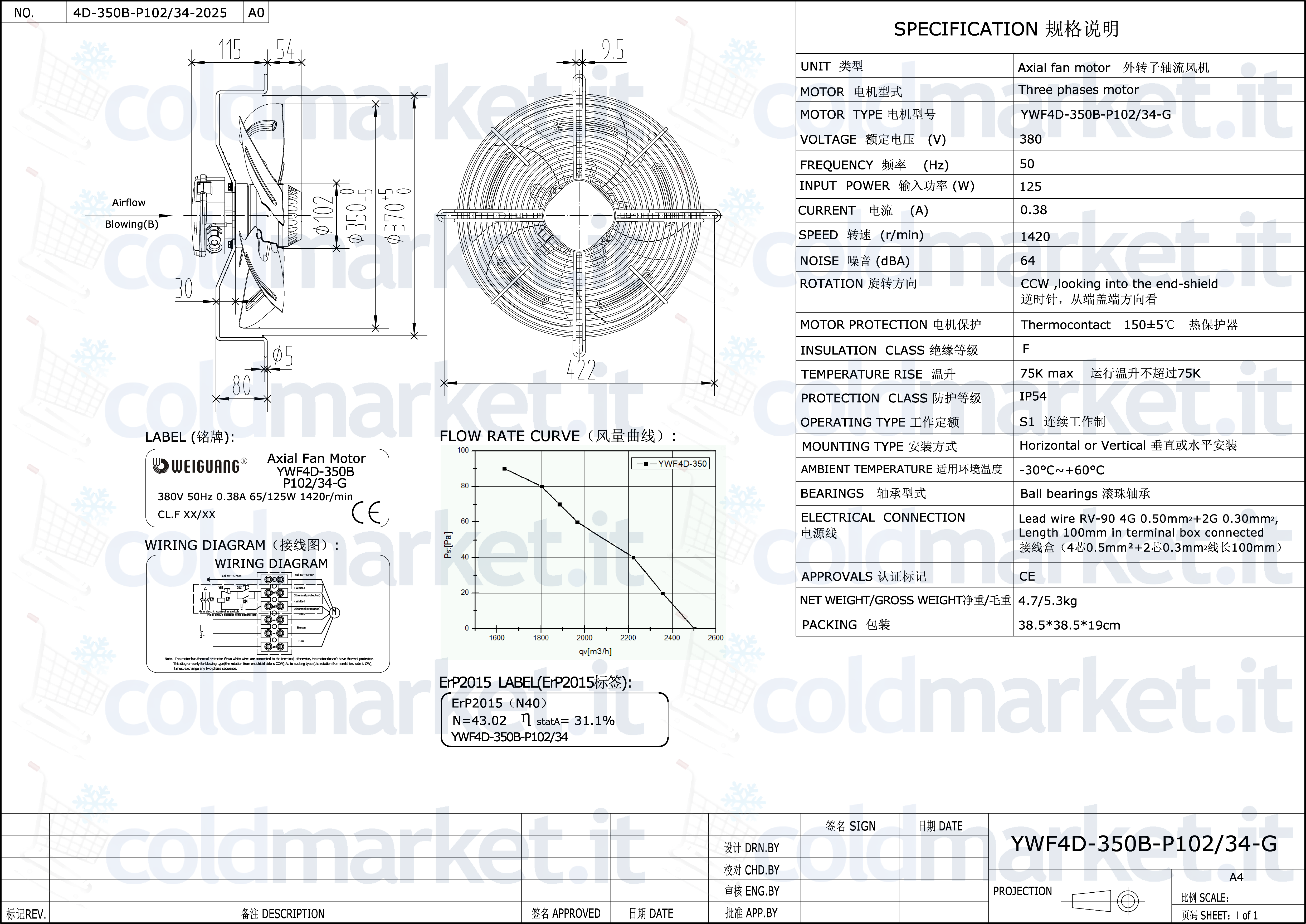 Ventilatore assiale premente Ø 350 mm Weiguang, alimentazione trifase 380V, velocità 1420 giri/min, grado di protezione IP54 e portata aria massima ≈ 2500 m³/h, ideale per impianti di refrigerazione, climatizzazione e ventilazione professionale e industriale.