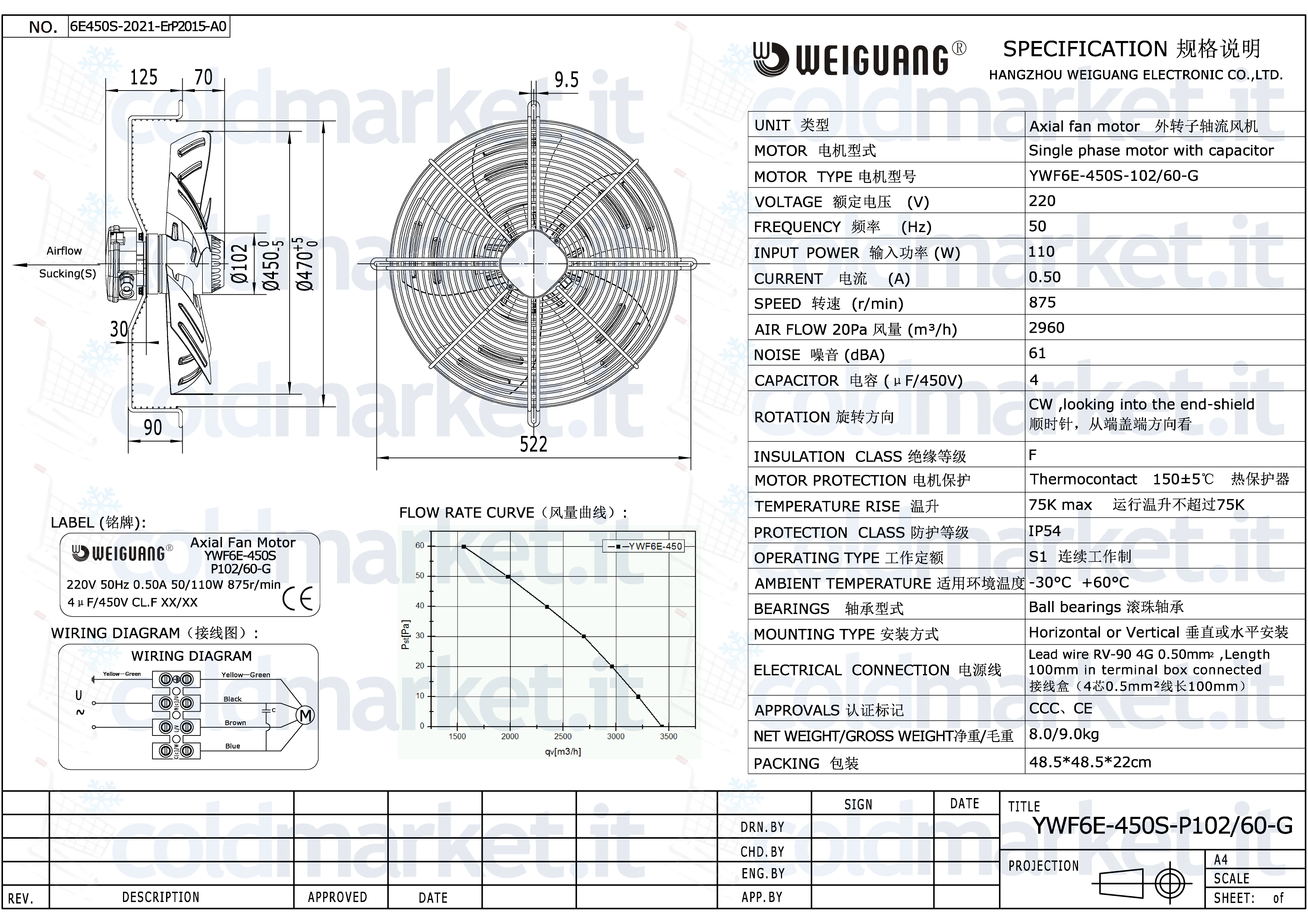 Ventilatore Assiale Ø 450 mm Aspirante 220V 875 giri/min Weiguang YWF6E-450S-P102L60-G