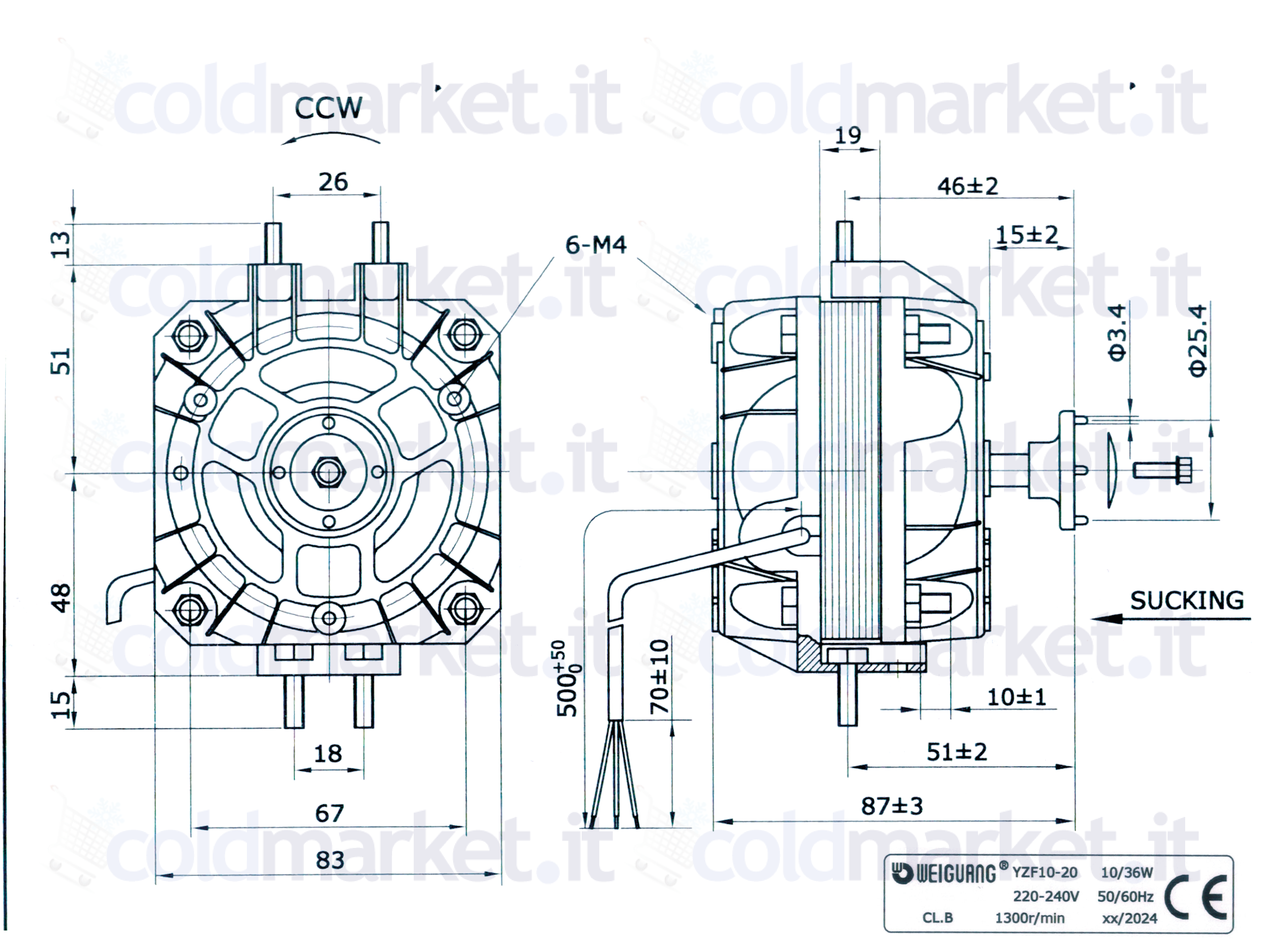 Motoventola Weiguang YZF-10 da 10 Watt, pentavalente, alimentazione 230V, velocità 1300 giri/min, ideale per frigoriferi commerciali, vetrine refrigerate, piccoli evaporatori e applicazioni di ventilazione compatta.