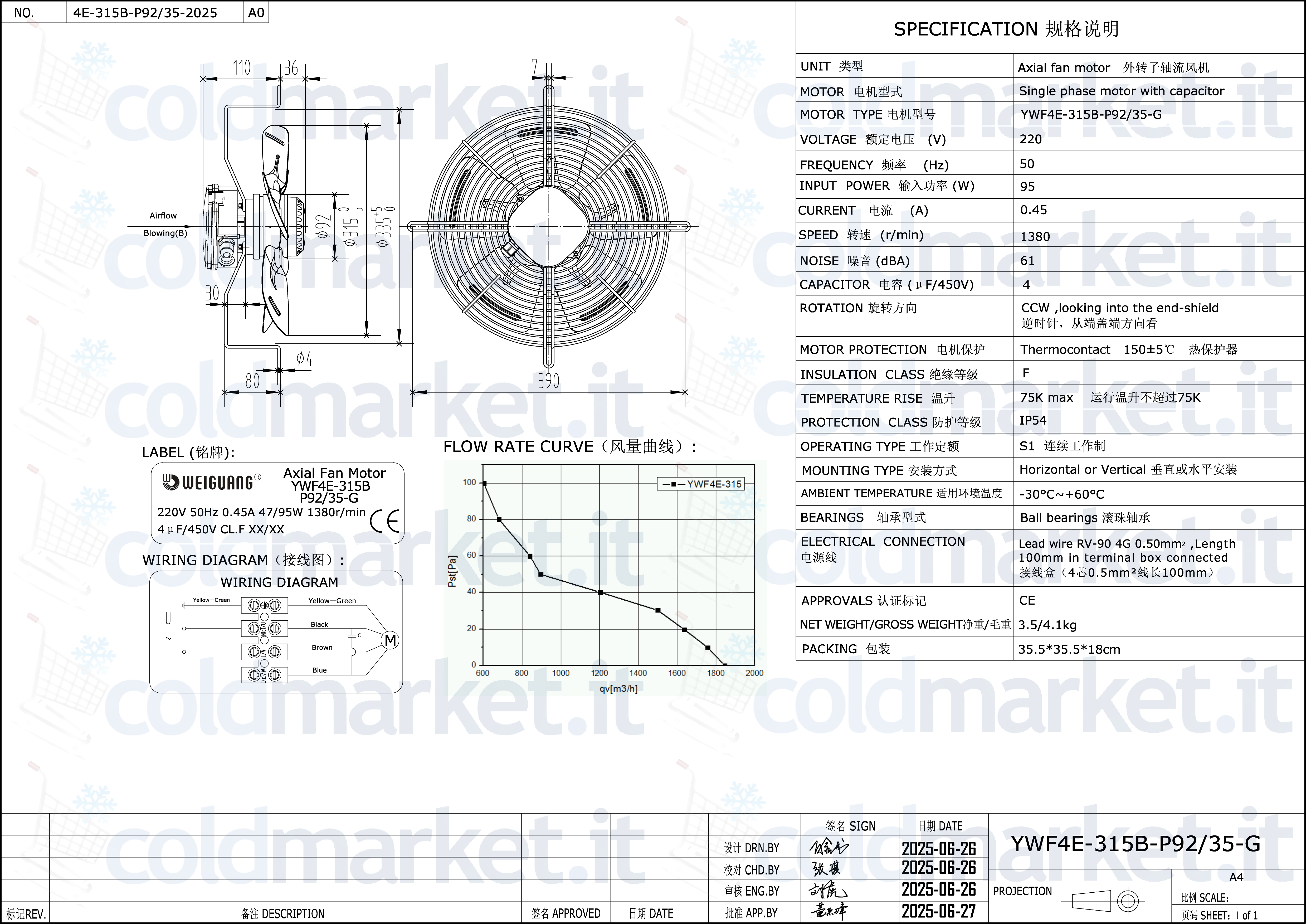 Ventilatore assiale premente Ø 315 mm Weiguang, alimentazione 220V, velocità 1400 giri/min, con condensatore integrato, grado di protezione IP54 e portata aria massima elevata, ideale per impianti di refrigerazione, climatizzazione e ventilazione professionale.