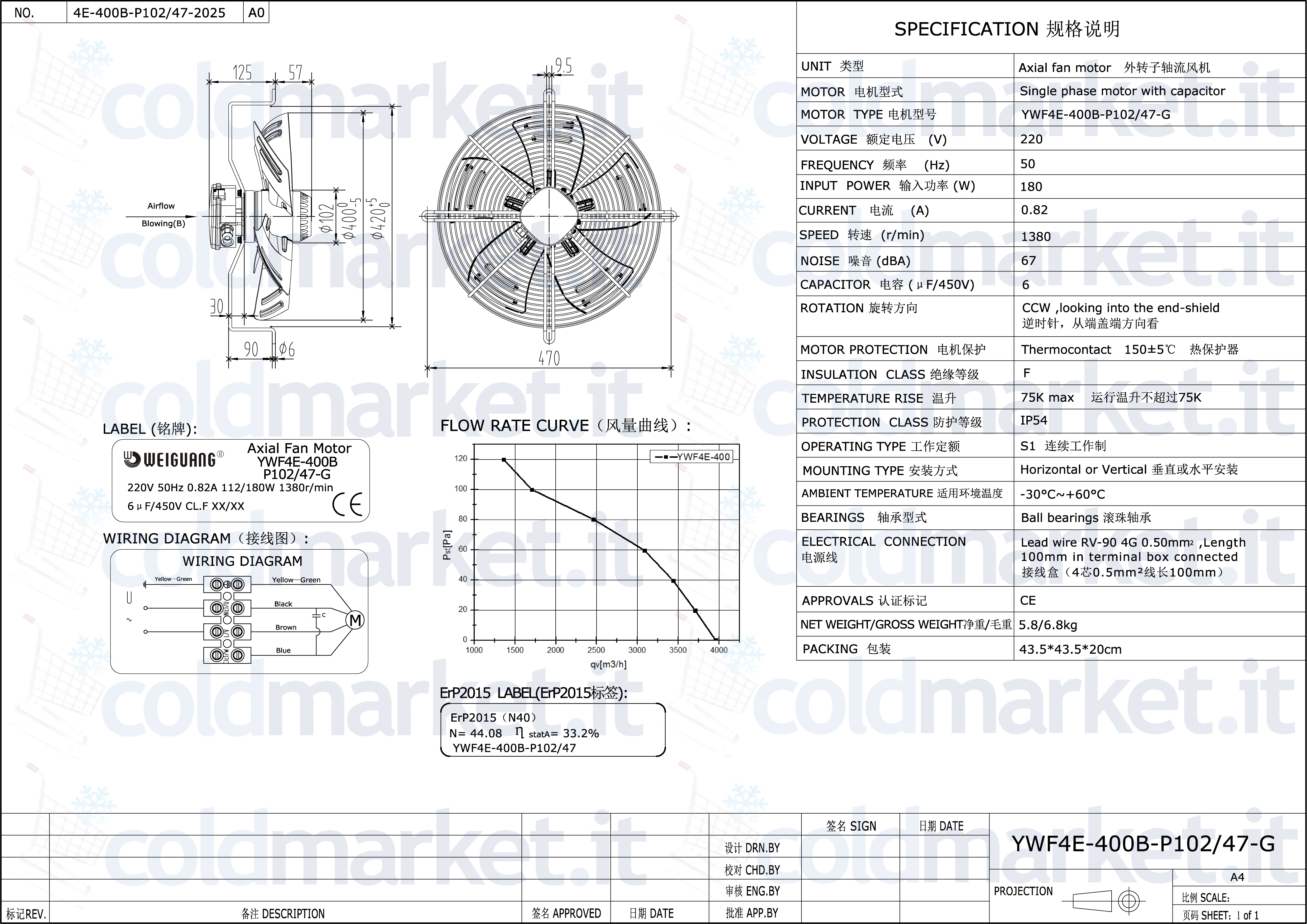 Ventilatore assiale premente Ø 400 mm Weiguang, alimentazione 220V, velocità 1380–1400 giri/min, con condensatore integrato, grado di protezione IP54 e portata aria massima ≈ 4000 m³/h, ideale per impianti di refrigerazione, climatizzazione e ventilazione professionale.