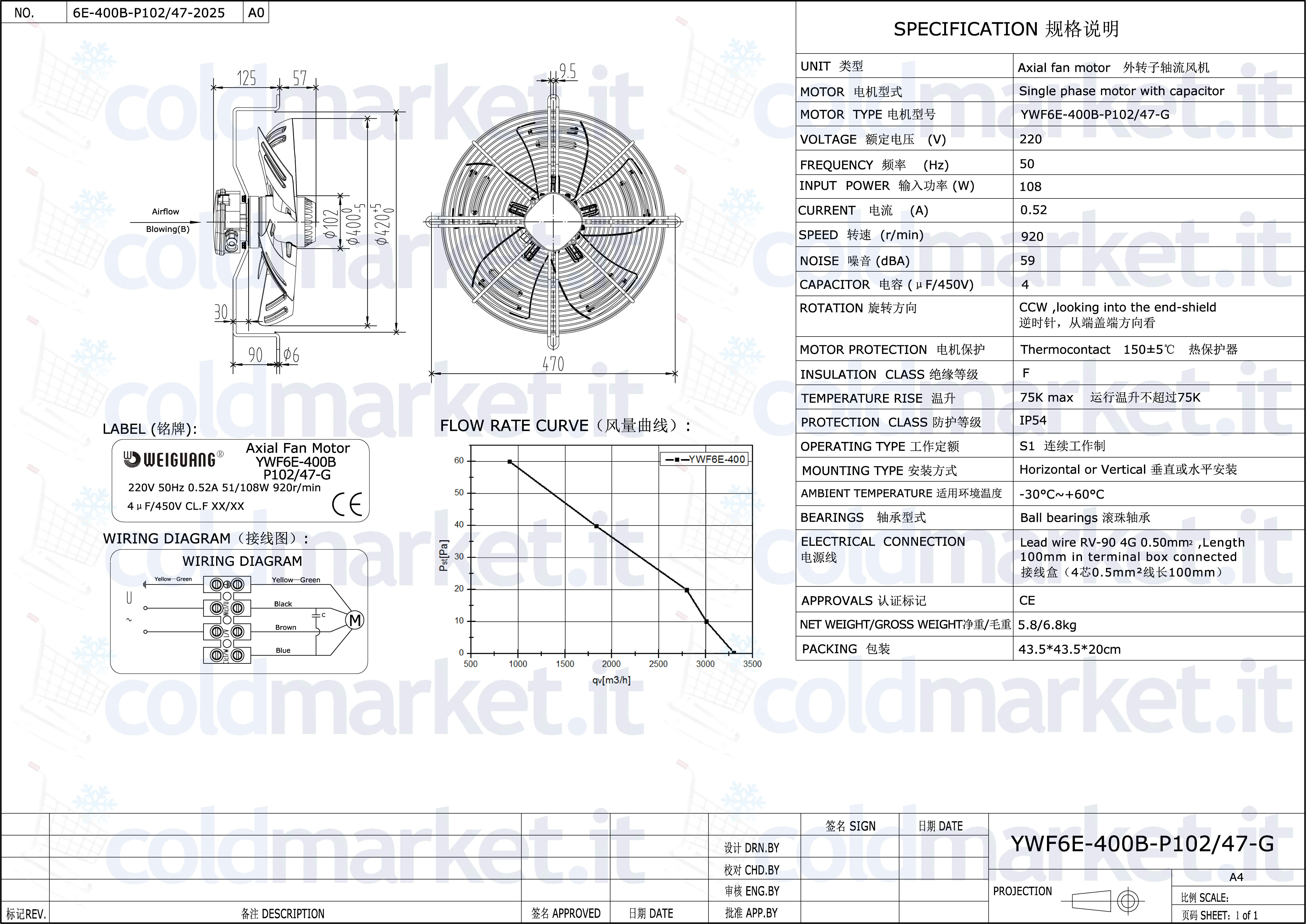 Ventilatore assiale premente Ø 400 mm Weiguang serie YWF6E, alimentazione 220V, velocità 900 giri/min, condensatore integrato, grado di protezione IP54 e bassa rumorosità, ideale per impianti di refrigerazione e climatizzazione dove è richiesta una spinta d’aria continua, uniforme e silenziosa.