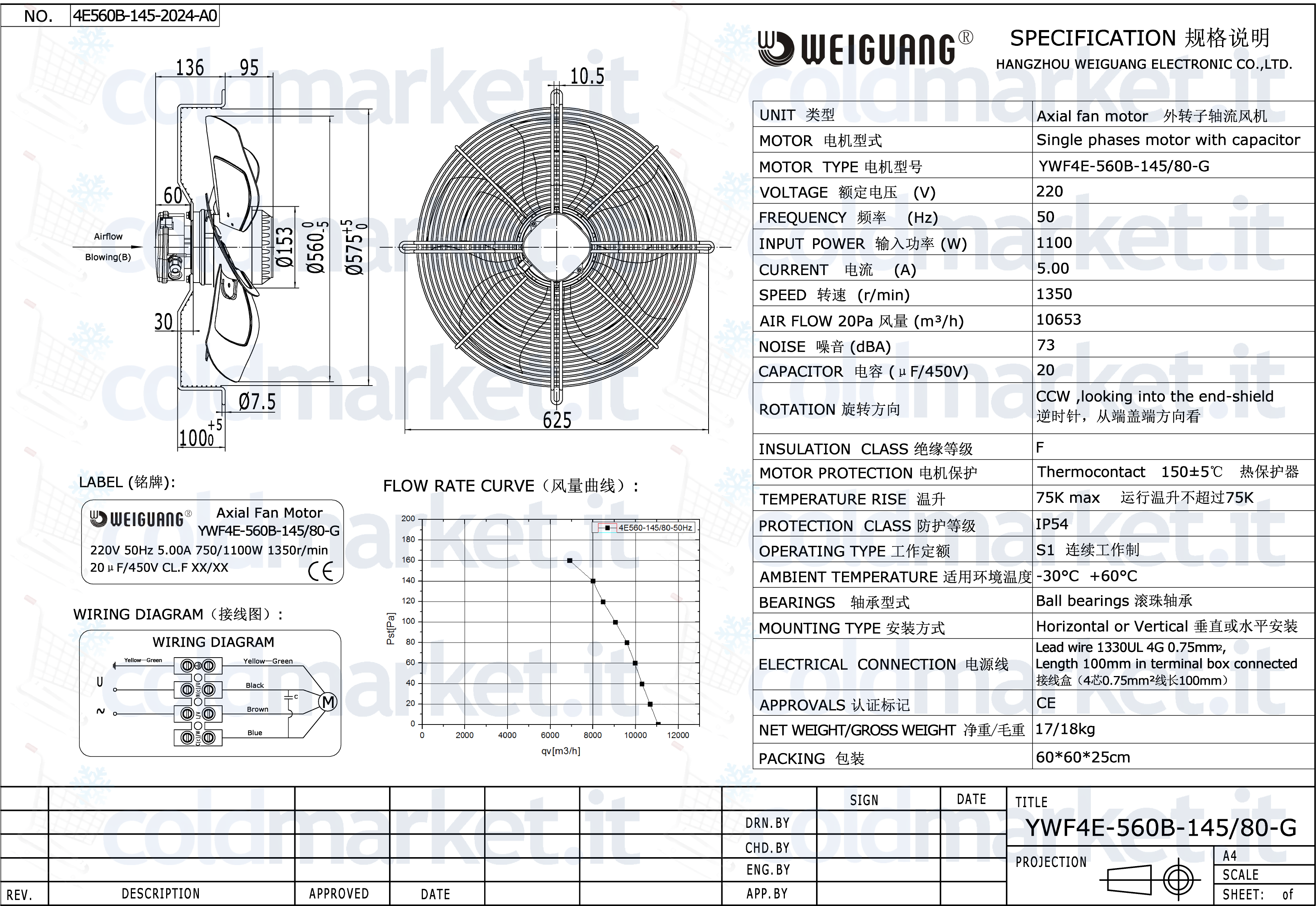 Ventilatore assiale premente Ø 560 mm Weiguang, alimentazione monofase 230V, velocità 1350 giri/min, grado di protezione IP54 e portata aria elevata, ideale per condensatori, unità condensanti, HVAC e refrigerazione professionale.