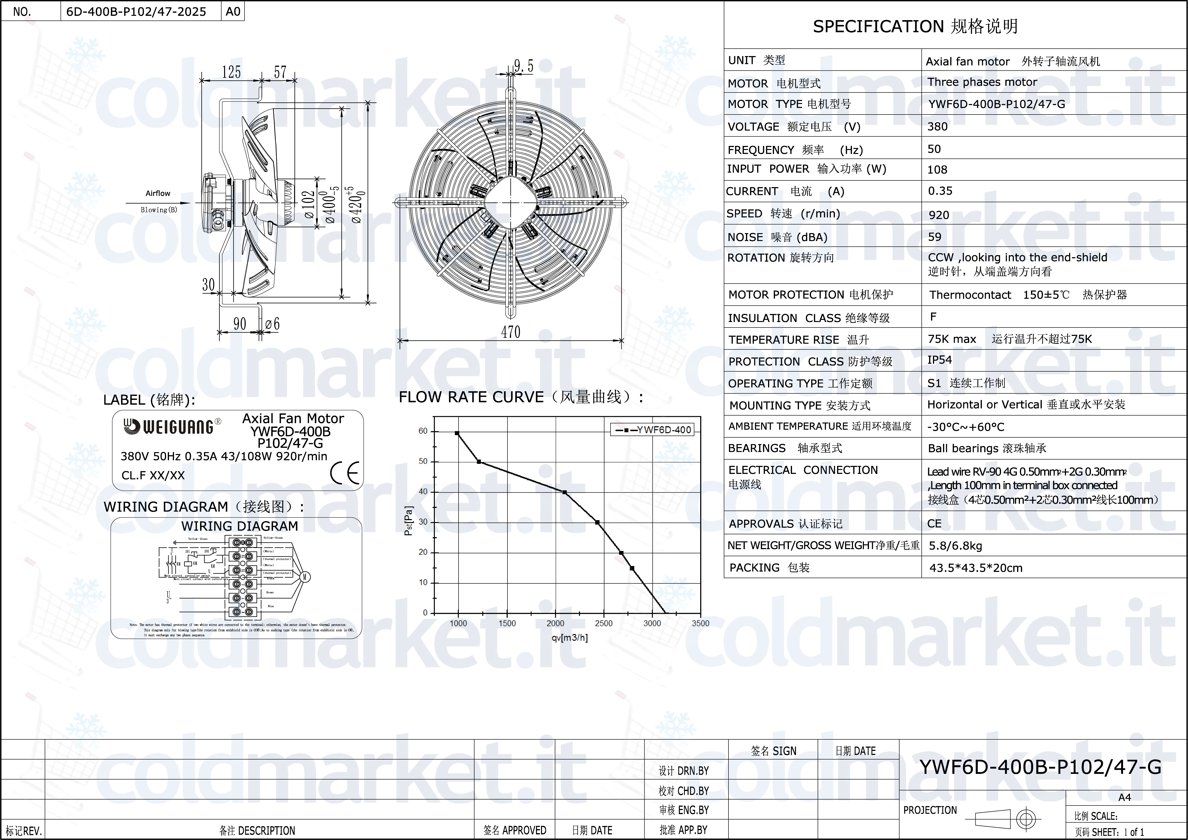 Ventilatore Assiale Ø 400 mm Premente Trifase 380V 900 giri/min Weiguang YWF6D-400B-P102L47-G