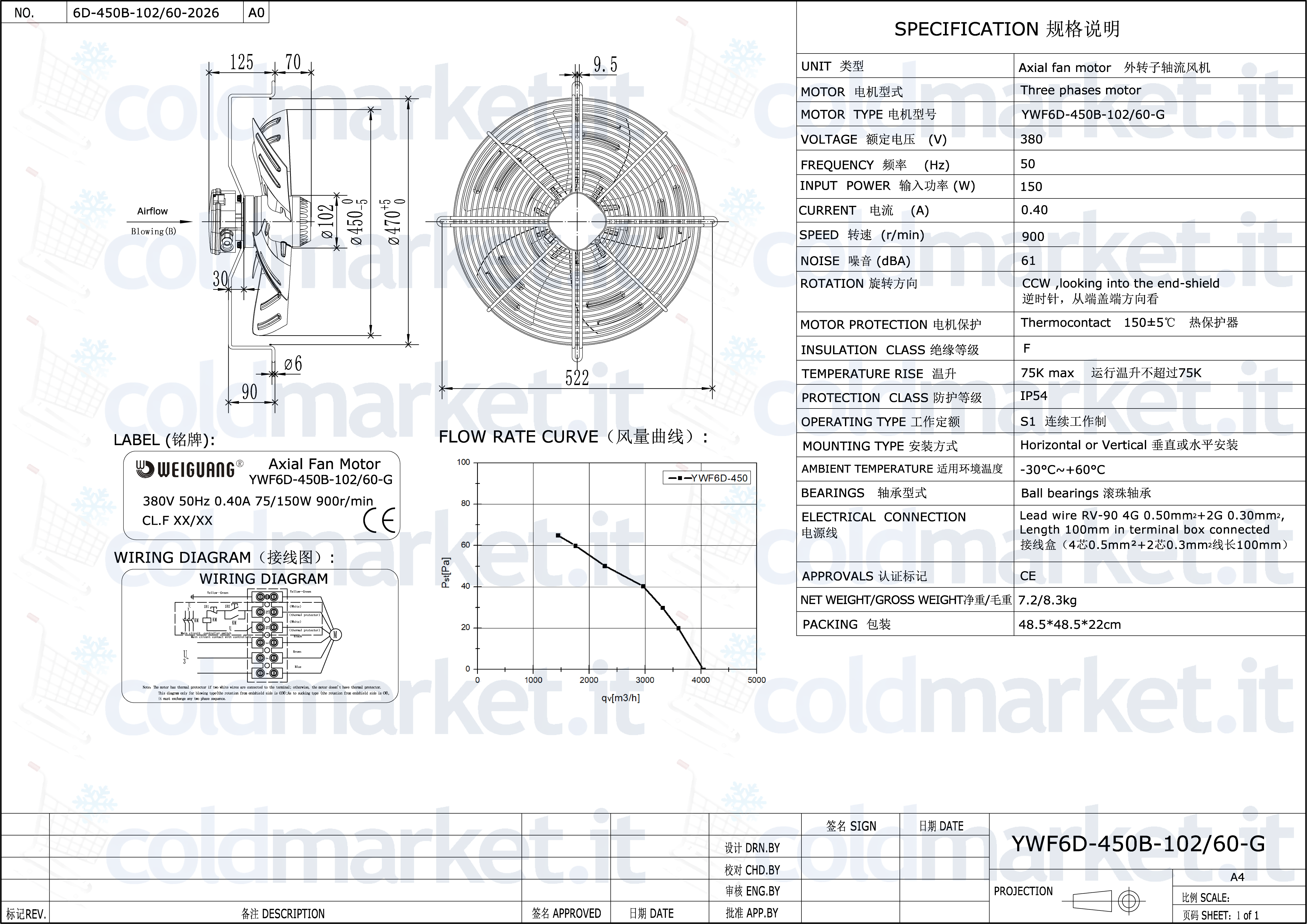Ventilatore Assiale Ø 450 mm Premente Trifase 380V 900 giri/min Weiguang YWF6D-450B-102L60-G