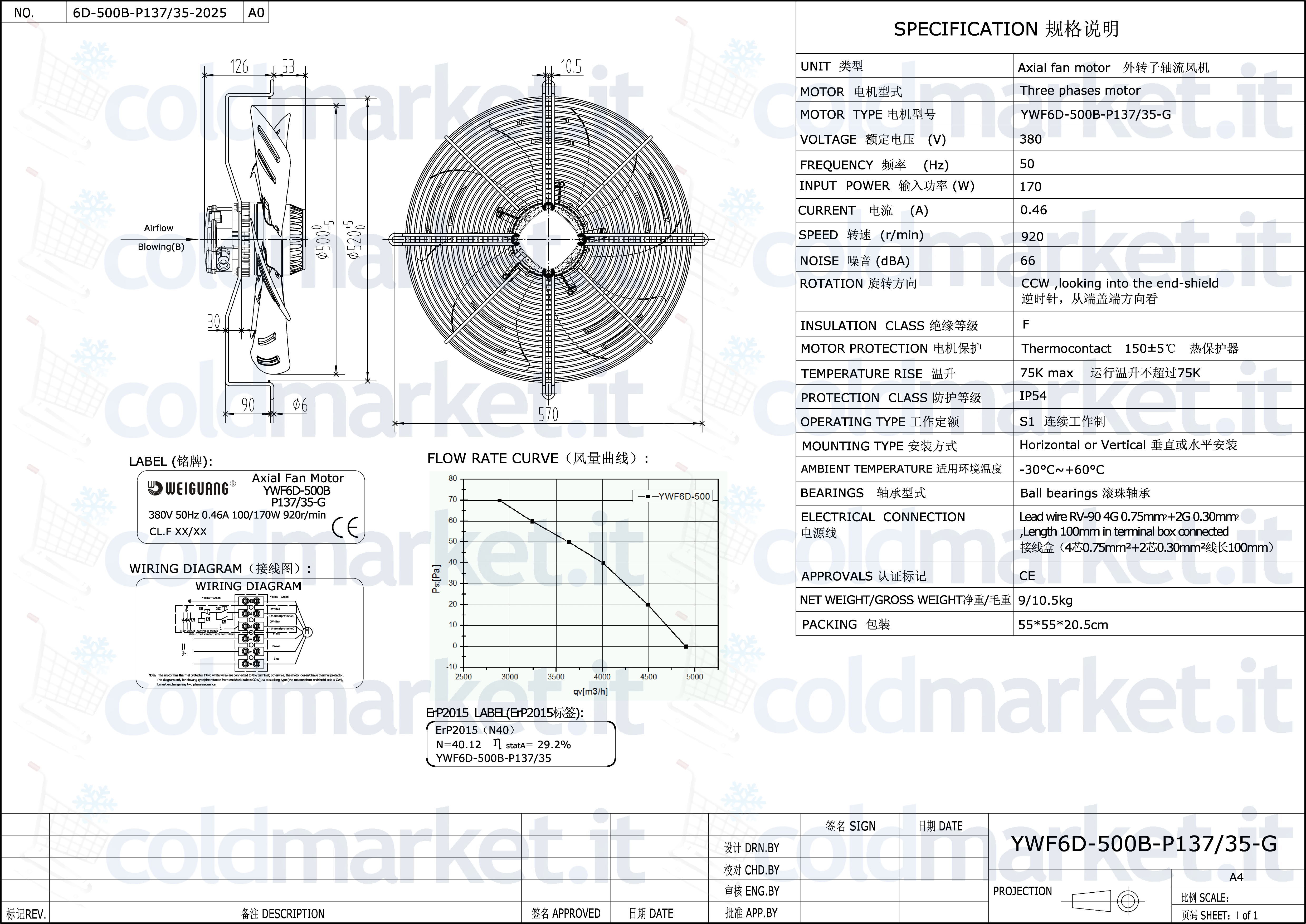 Ventilatore assiale premente Ø 500 mm Weiguang, alimentazione trifase 380V, velocità 920 giri/min, grado di protezione IP54 e portata aria elevata, ideale per condensatori, unità condensanti, climatizzazione e refrigerazione professionale.
