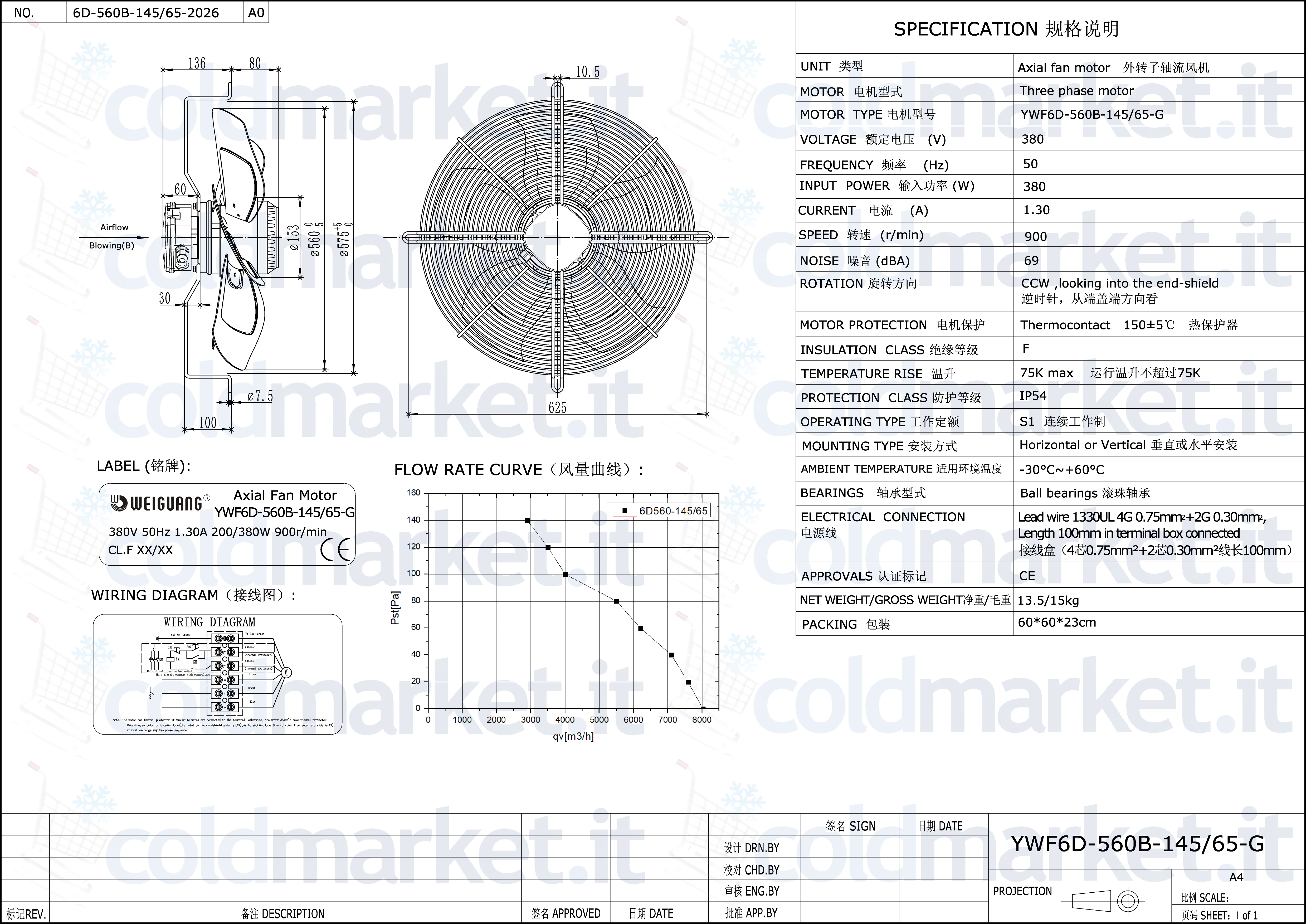 Ventilatore assiale premente Ø 560 mm Weiguang, alimentazione trifase 380V, velocità 900 giri/min, grado di protezione IP54 e portata aria elevata, ideale per condensatori, unità condensanti, HVAC e refrigerazione industriale.