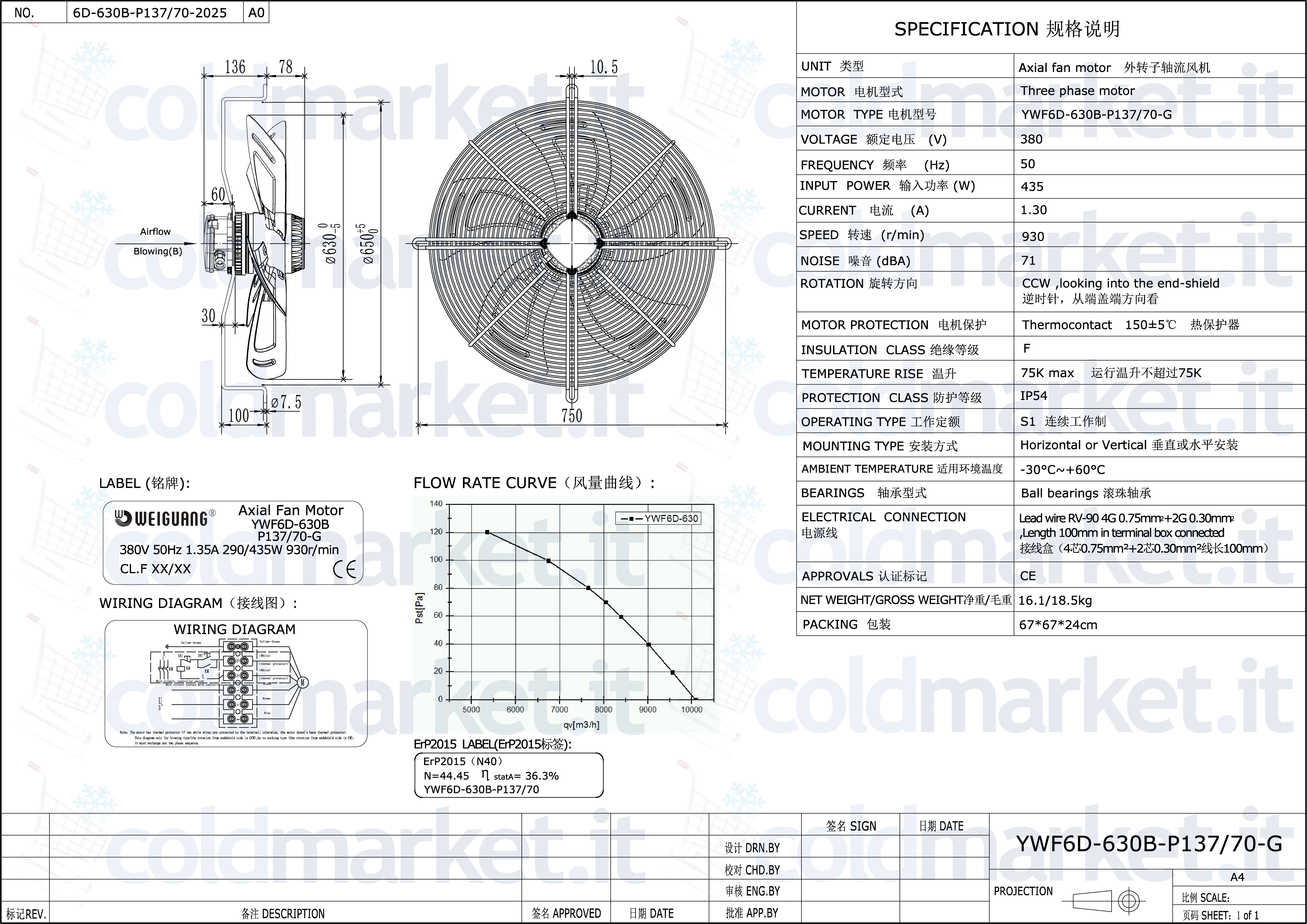 Ventilatore assiale premente Ø 630 mm Weiguang, alimentazione trifase 380V, velocità 930 giri/min, grado di protezione IP54 e portata aria molto elevata, ideale per impianti di refrigerazione, climatizzazione e ventilazione industriale.