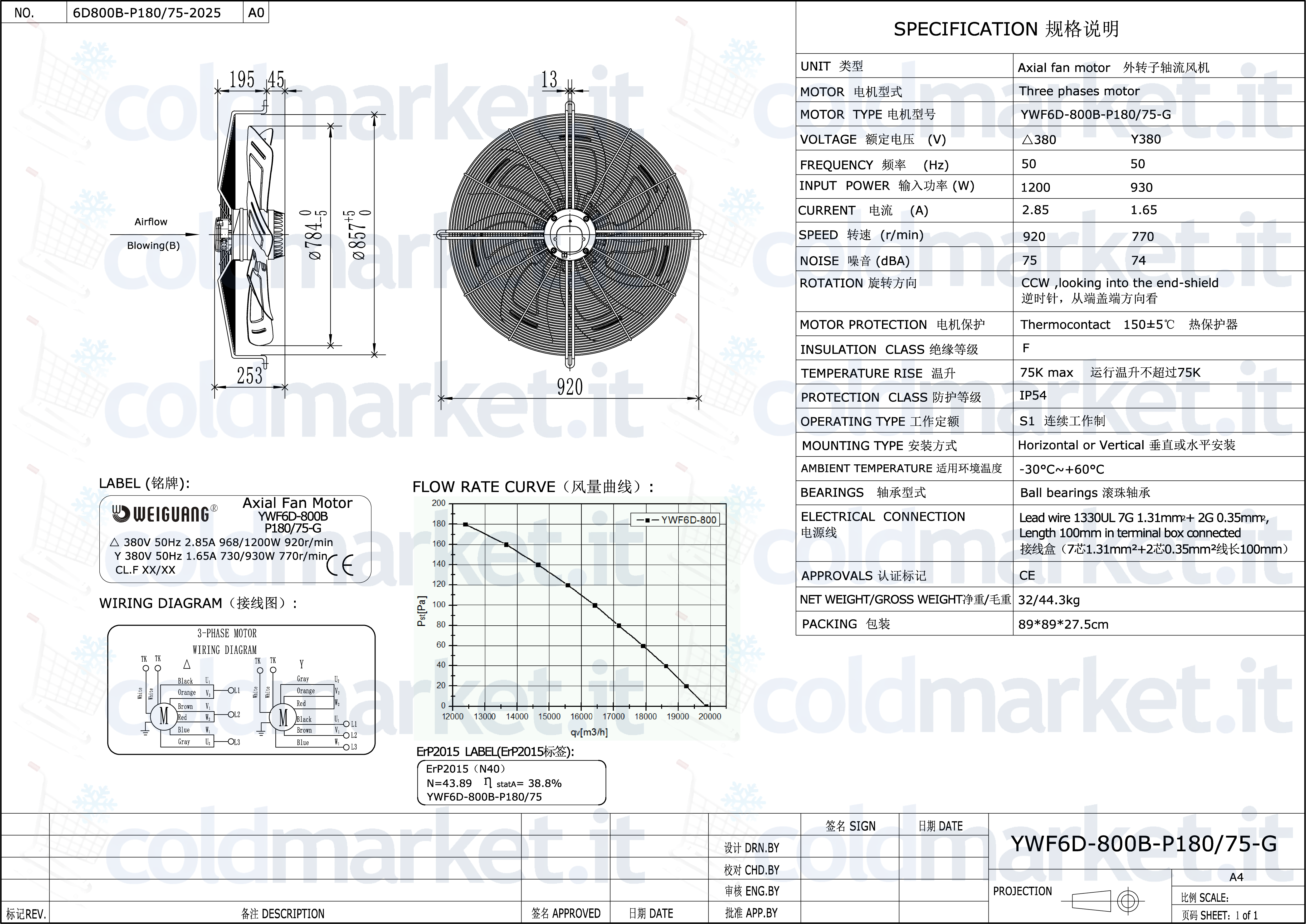 Ventilatore Assiale Ø 800 mm Premente Trifase 380V 730 giri/min Weiguang YWF6D-800B-P180L75-G