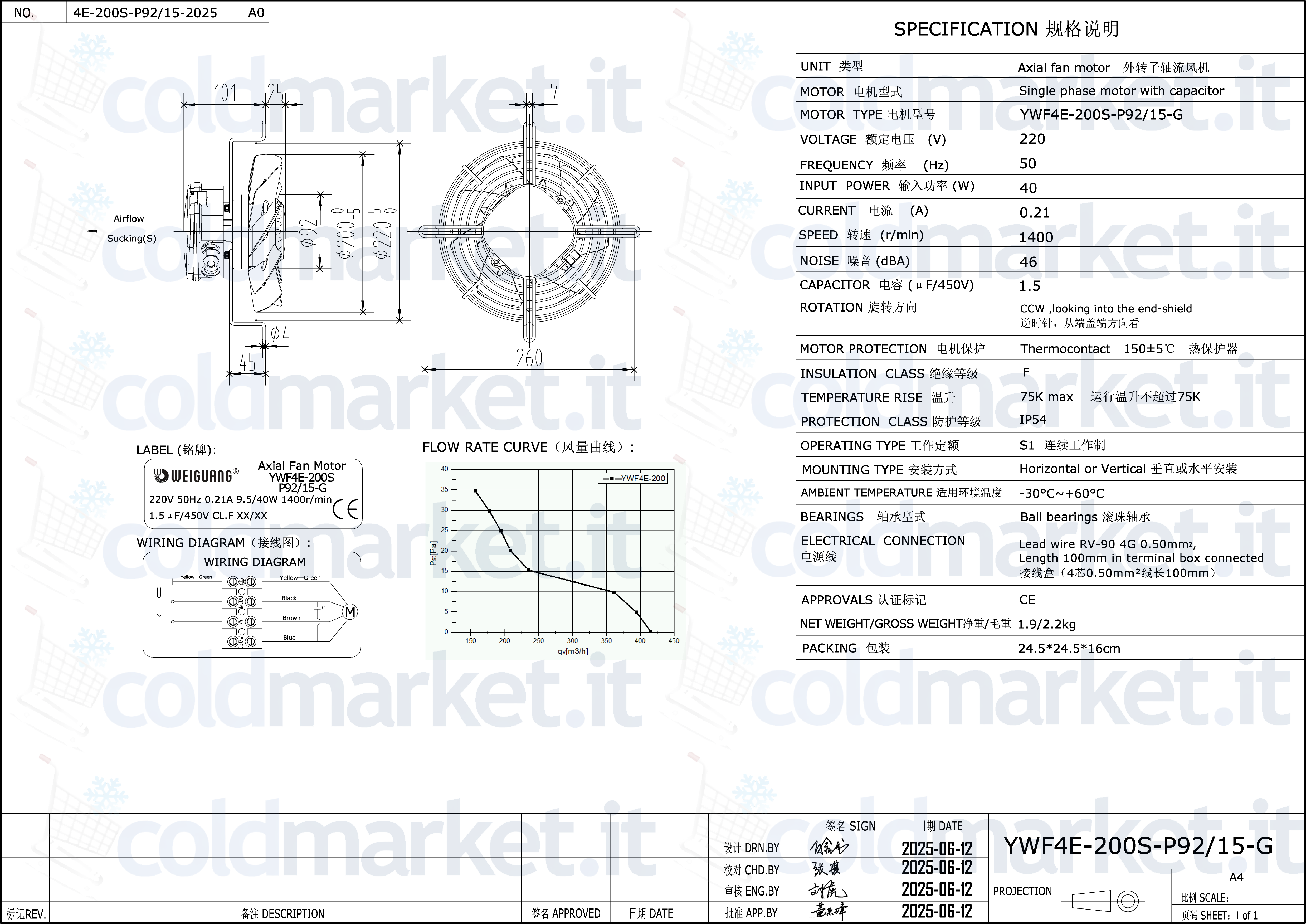 Ventilatore assiale aspirante Ø 200 mm Weiguang, alimentazione 220V, velocità 1400 giri/min, con condensatore integrato, grado di protezione IP54 e portata aria massima ≈ 420 m³/h, ideale per impianti di refrigerazione, climatizzazione e ventilazione professionale.