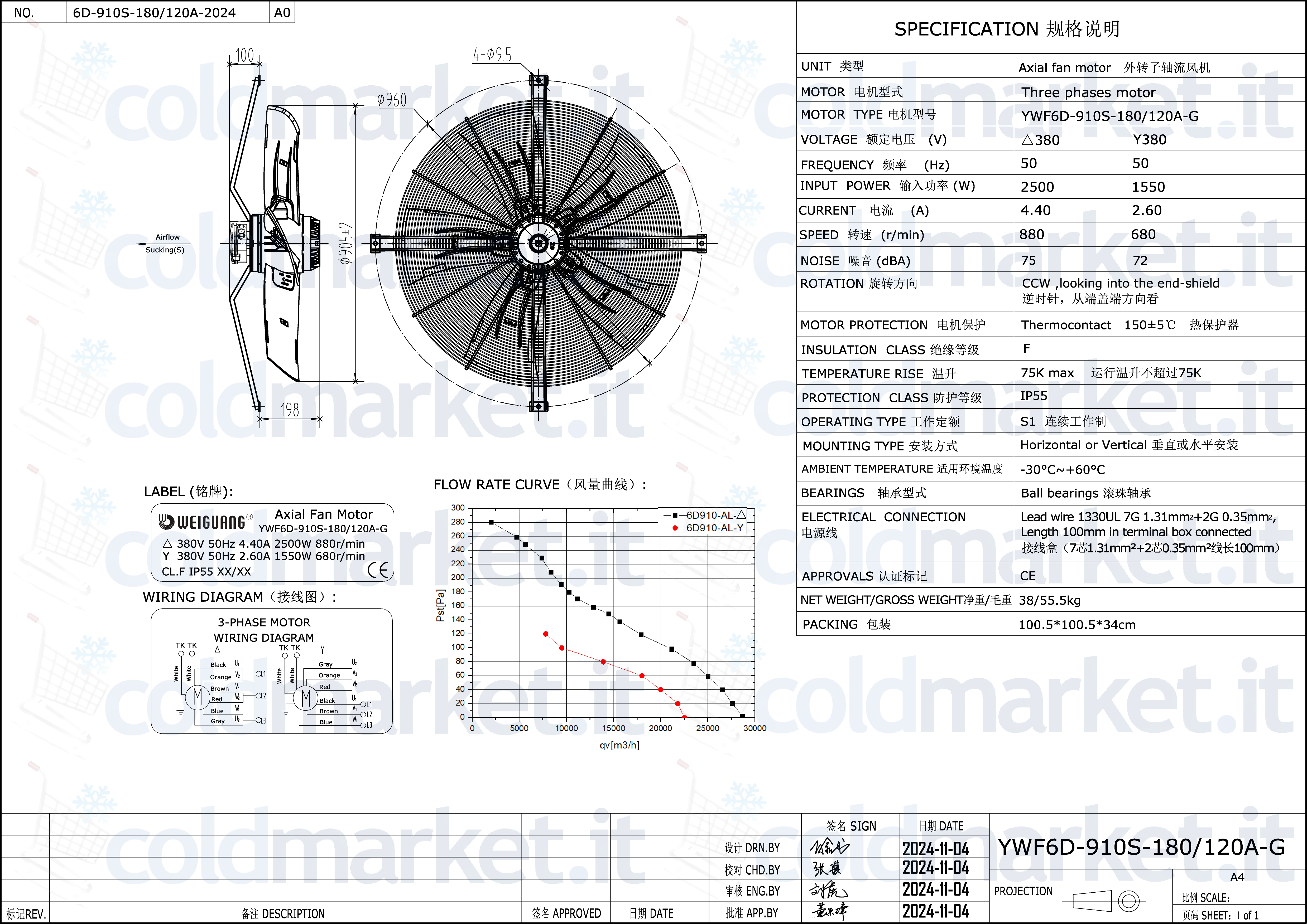 Ventilatore Assiale Ø 910 mm Aspirante Trifase 380V 880 giri/min Weiguang YWF6D-910S-180/120A-G