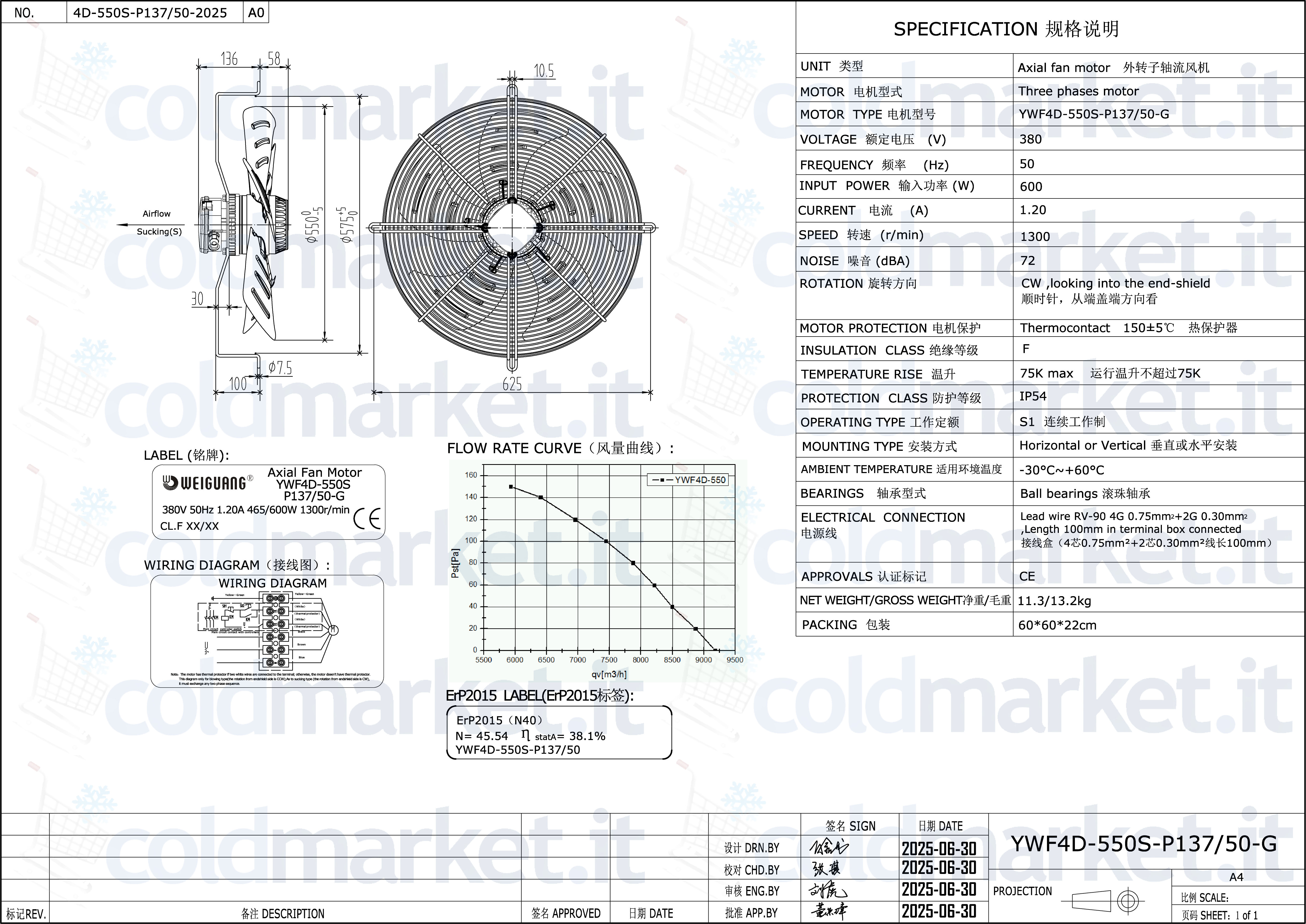 Ventilatore assiale aspirante Ø 550 mm Weiguang, alimentazione trifase 380V, velocità 1300 giri/min, grado di protezione IP54 e portata aria massima ≈ 8500 m³/h, ideale per impianti di refrigerazione, climatizzazione e ventilazione industriale ad alta potenza.