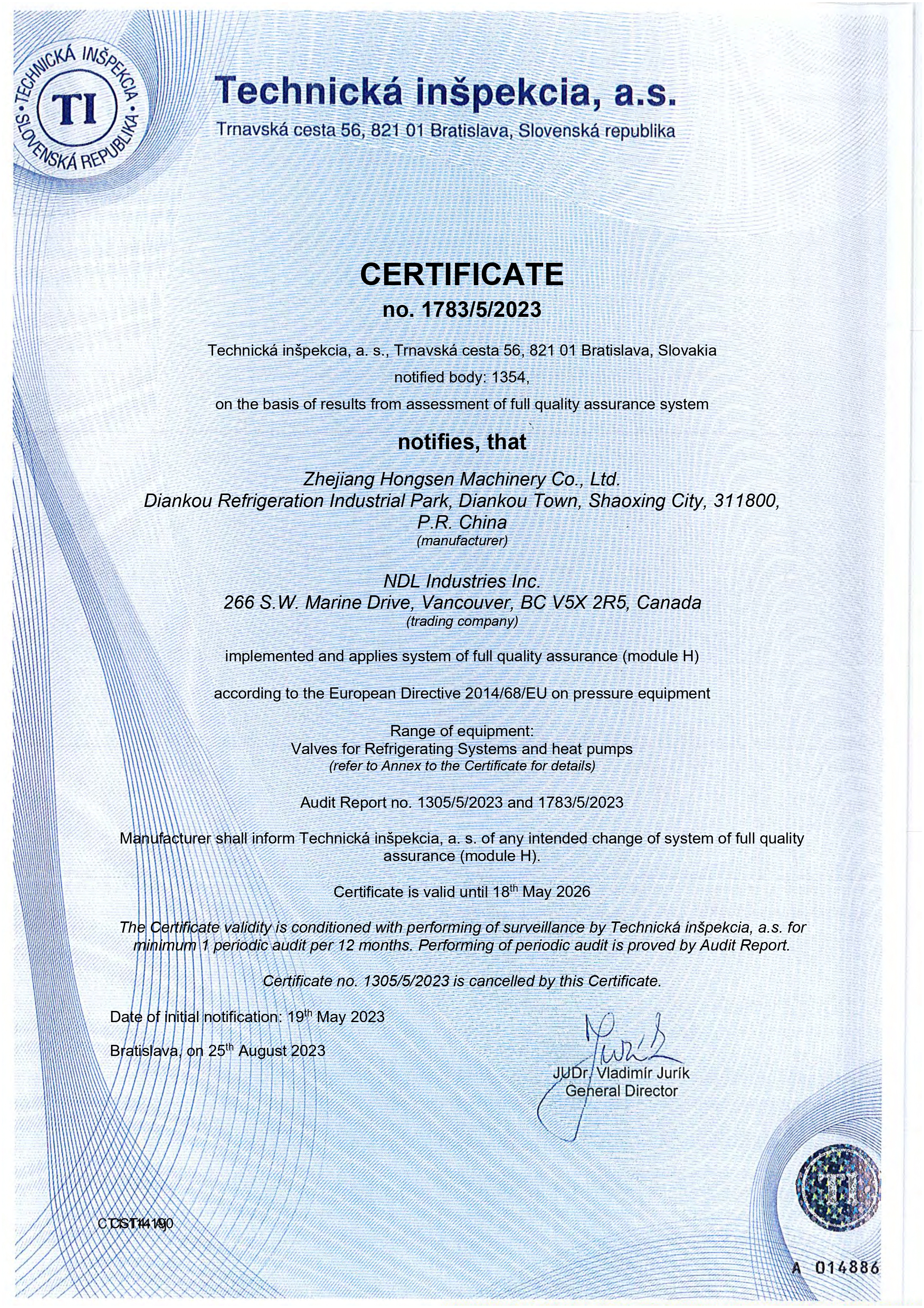Il prodotto è conforme ai requisiti della Direttiva Europea 2014/68/EU (Pressure Equipment Directive – PED) per apparecchiature in pressione, garantendo sicurezza e idoneità per impianti HVAC/R professionali.