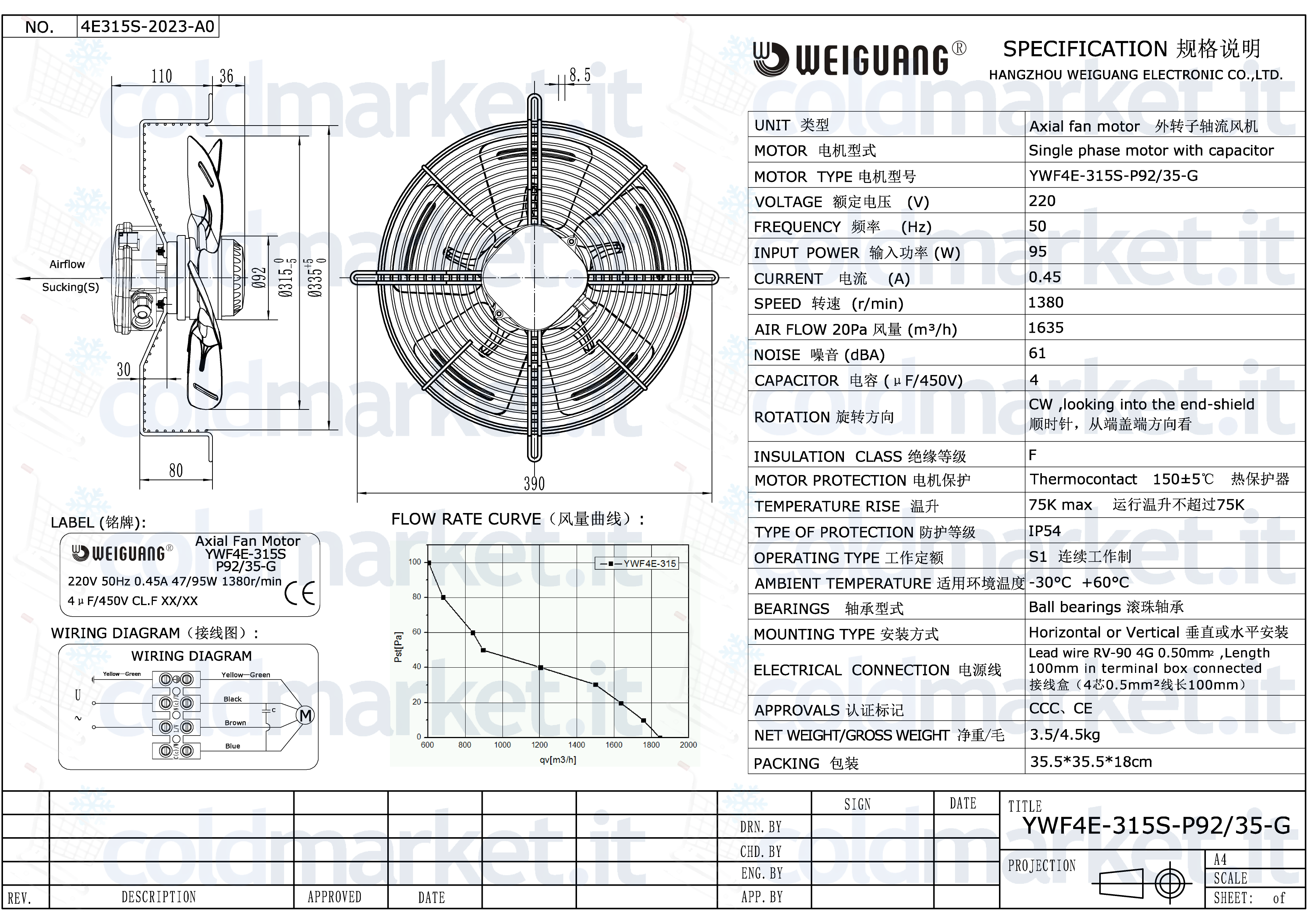 Ventilatore assiale aspirante Ø 315 mm Weiguang, alimentazione 220V, velocità 1400 giri/min, con condensatore integrato, grado di protezione IP54 e portata aria massima elevata, ideale per impianti di refrigerazione, climatizzazione e ventilazione professionale.