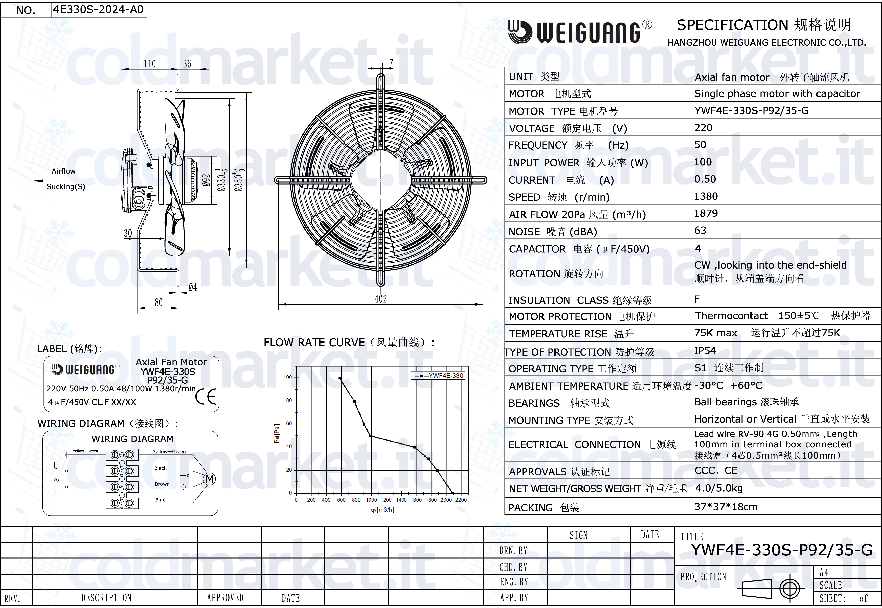 Ventilatore assiale aspirante Ø 330 mm Weiguang, alimentazione 220V, velocità 1400 giri/min, con condensatore integrato, grado di protezione IP54 e portata aria massima ≈ 2200 m³/h, ideale per impianti di refrigerazione, climatizzazione e ventilazione professionale.