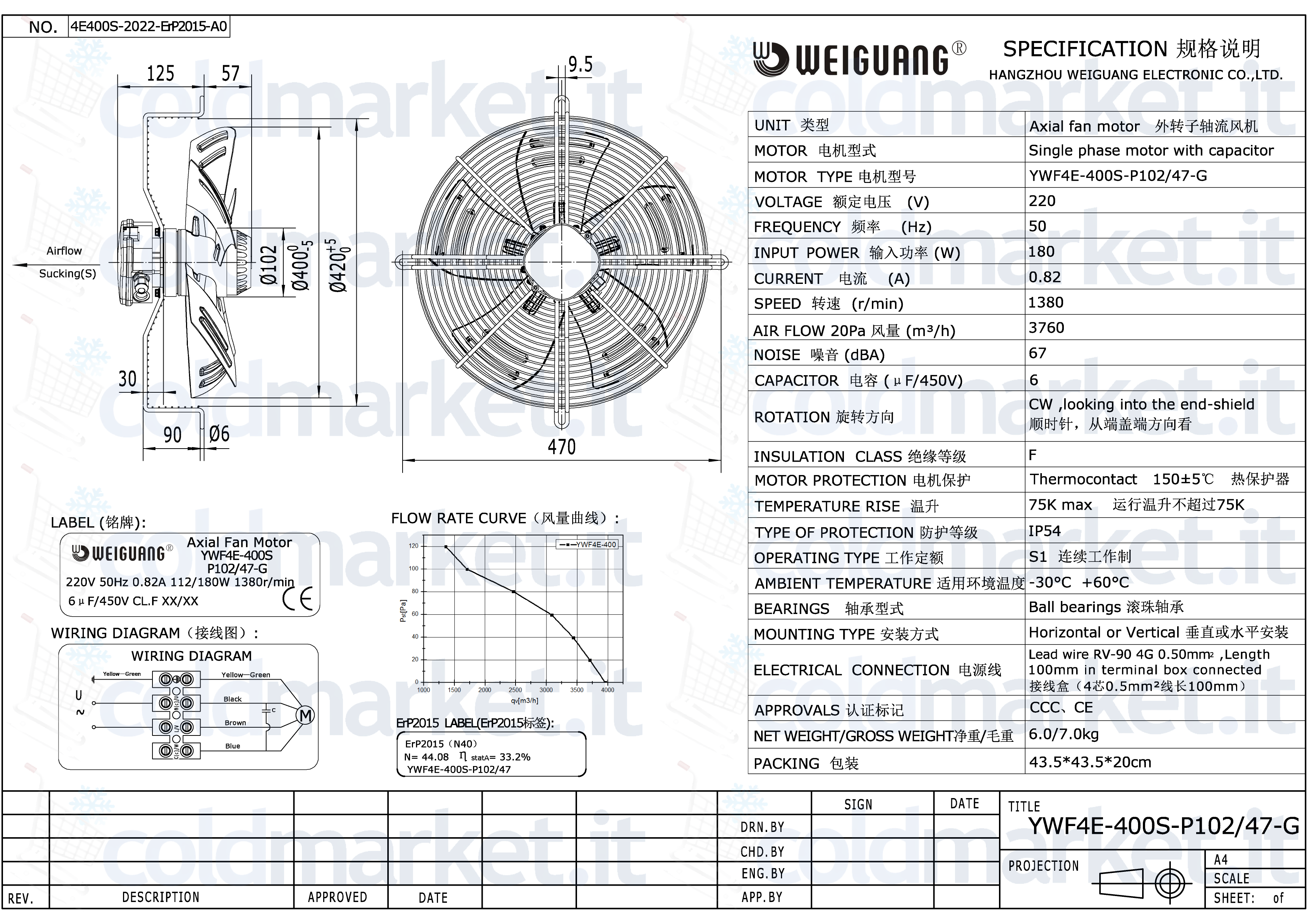 Ventilatore assiale aspirante Ø 400 mm Weiguang, alimentazione 220V, velocità 1380–1400 giri/min, con condensatore integrato, grado di protezione IP54 e portata aria massima ≈ 4000 m³/h, ideale per impianti di refrigerazione, climatizzazione e ventilazione professionale.