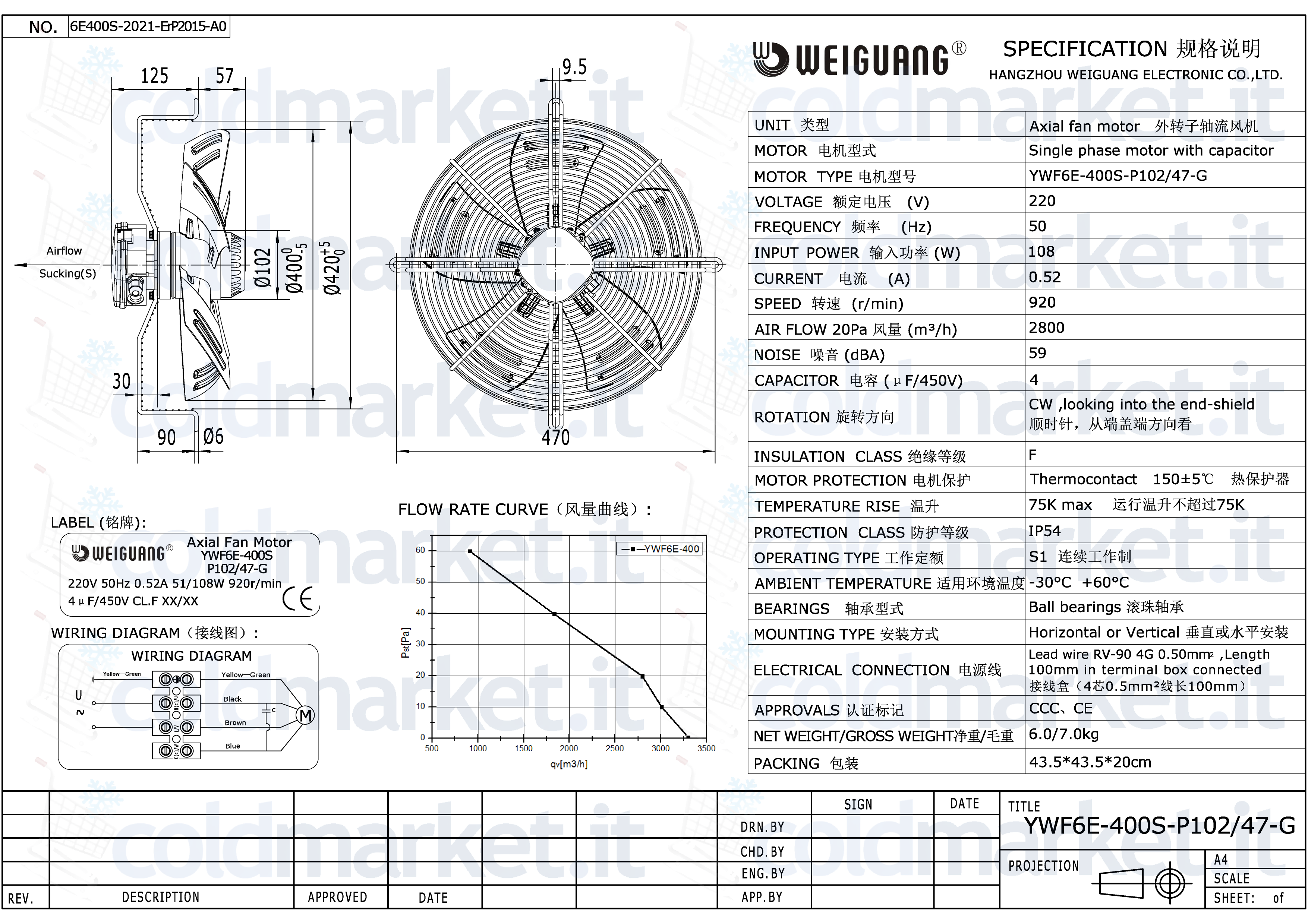 Ventilatore assiale aspirante Ø 400 mm Weiguang serie YWF6E, alimentazione 220V, velocità 900 giri/min, condensatore integrato, grado di protezione IP54 e bassa rumorosità, ideale per impianti di refrigerazione e climatizzazione dove è richiesto un flusso d’aria continuo, stabile e silenzioso.