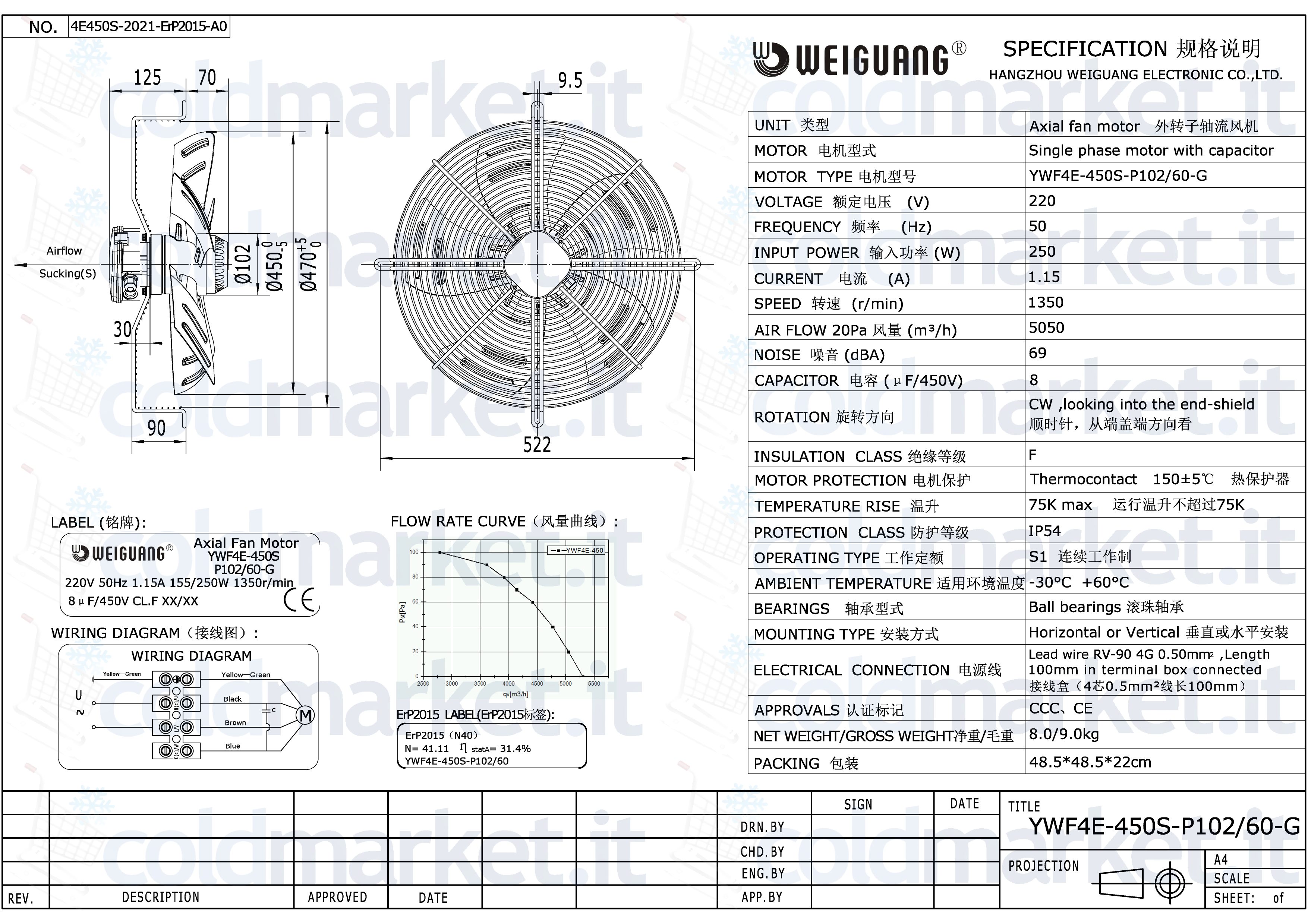 Ventilatore Assiale Ø 450 mm Aspirante 220V 1350 giri/min Weiguang YWF4E-450S-P102L60-G