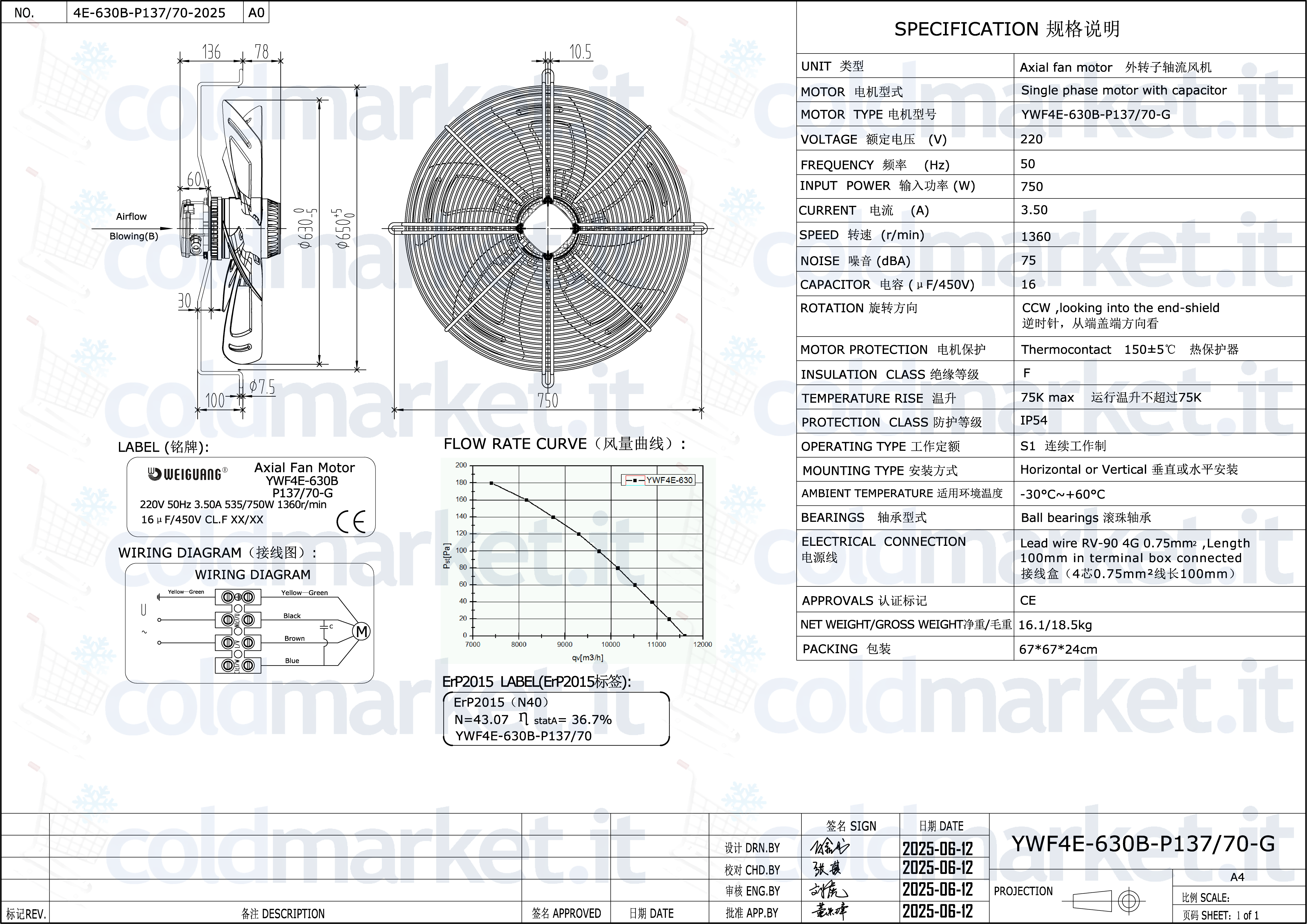 Ventilatore assiale premente Ø 630 mm Weiguang, alimentazione 220V, velocità 1360 giri/min, grado di protezione IP54 e portata aria molto elevata, ideale per condensatori, unità condensanti, HVAC e refrigerazione professionale. Spinta d’aria potente e continua, progettato per funzionamento continuo (S1), con motore monofase con condensatore e componenti affidabili.