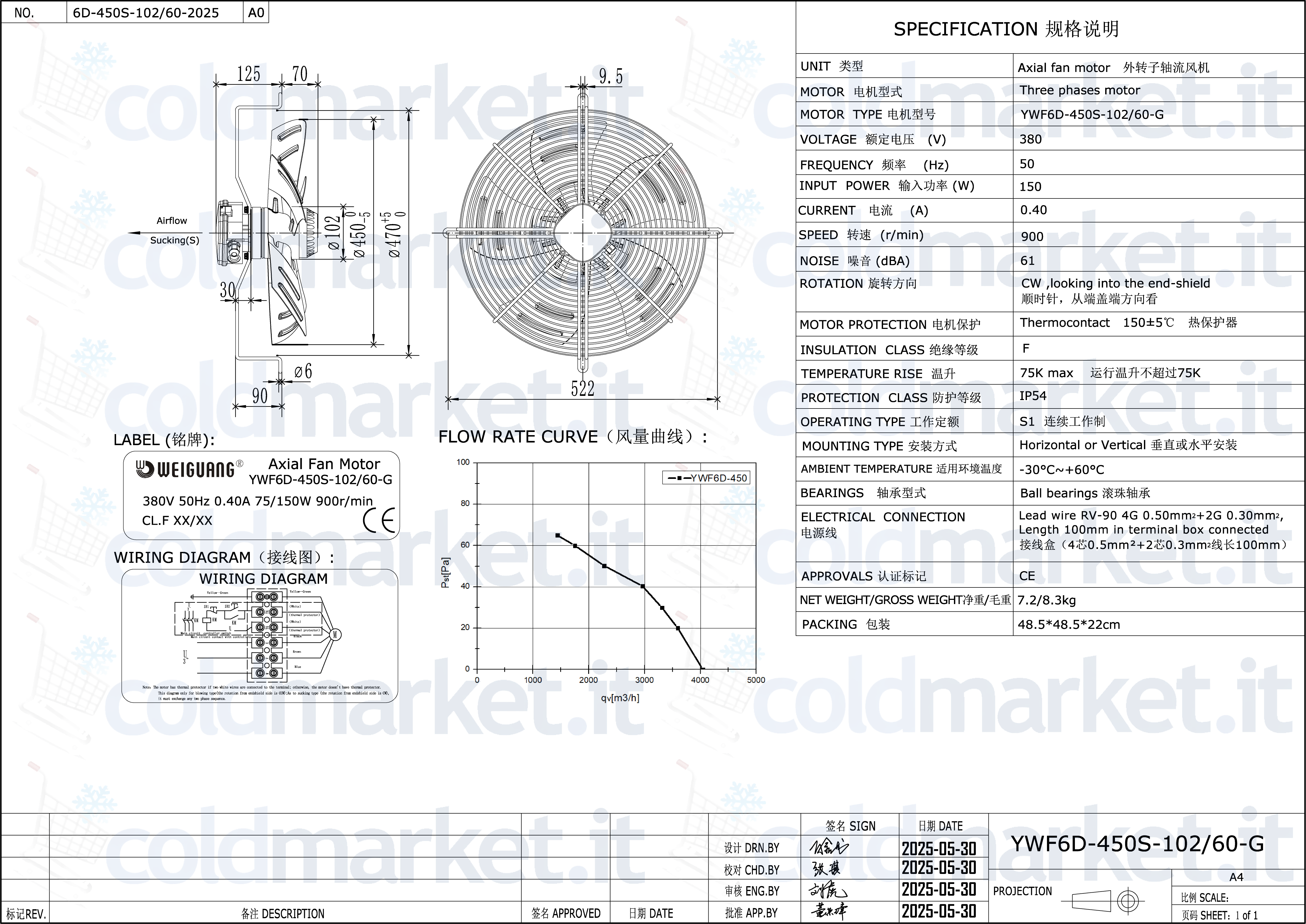 Ventilatore Assiale Ø 450 mm Aspirante Trifase 380V 900 giri/min Weiguang YWF6D-450S-102L60-G